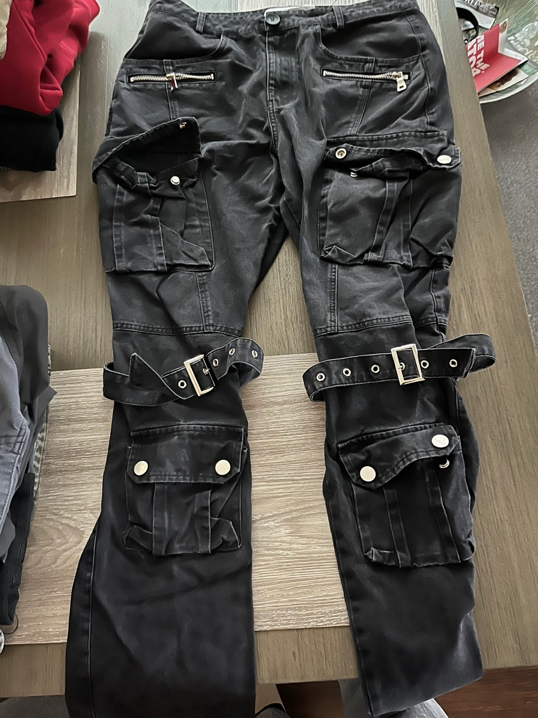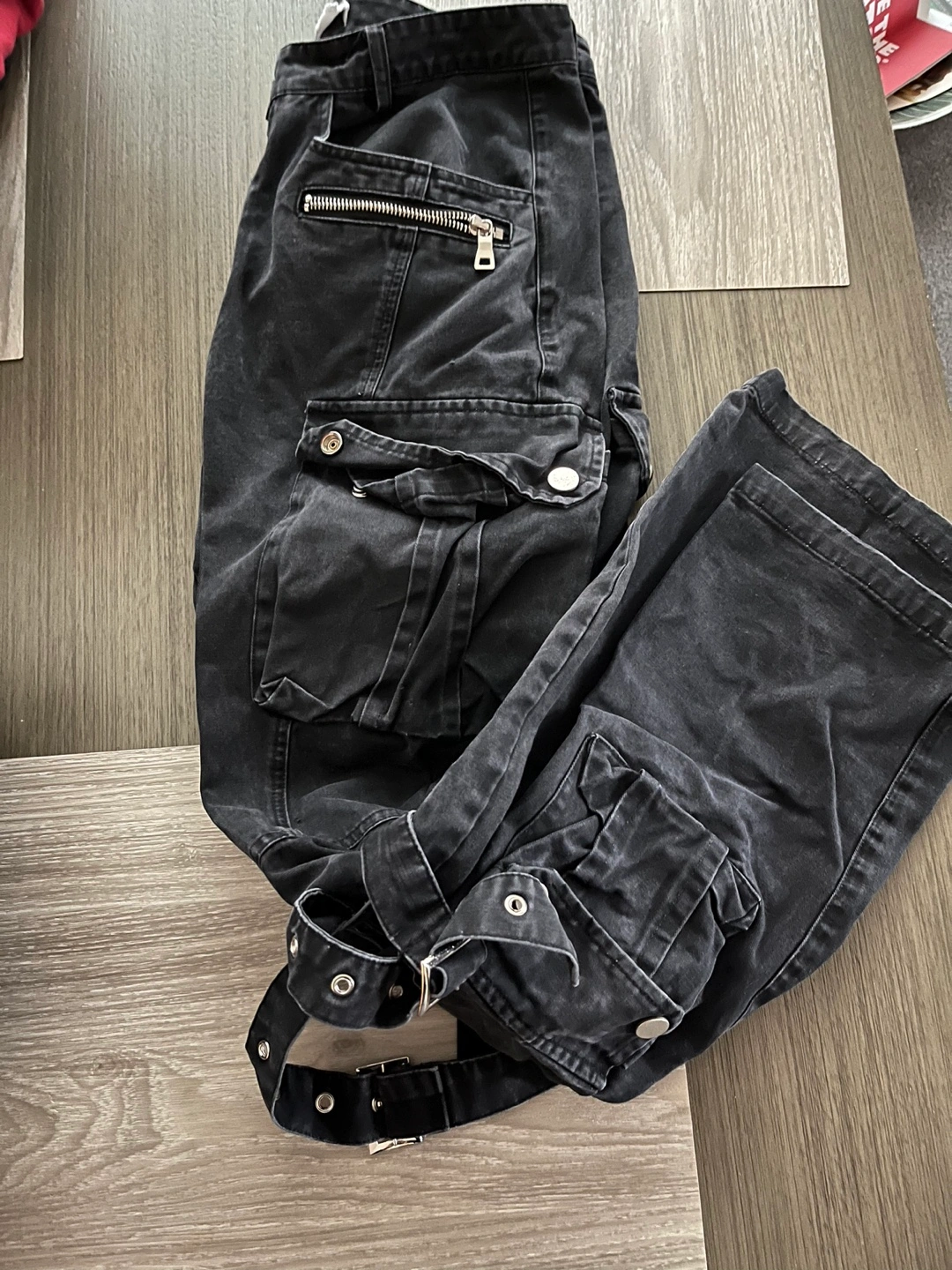 Black cargo pants. Multiple pockets. Buckle details. Zipper accents. Excellent condition.