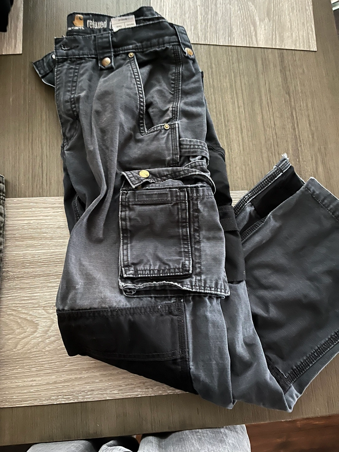Men's Carhartt cargo pants. Relaxed fit. Size 33x32. Dark grey and black. Multiple pockets. Good condition.