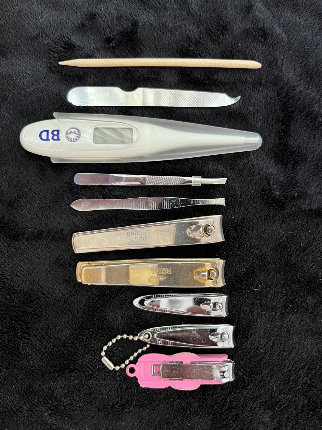 Various nail care tools, including nail clippers, tweezers, nail file, and orangewood stick. Includes a digital thermometer. Great for travel.