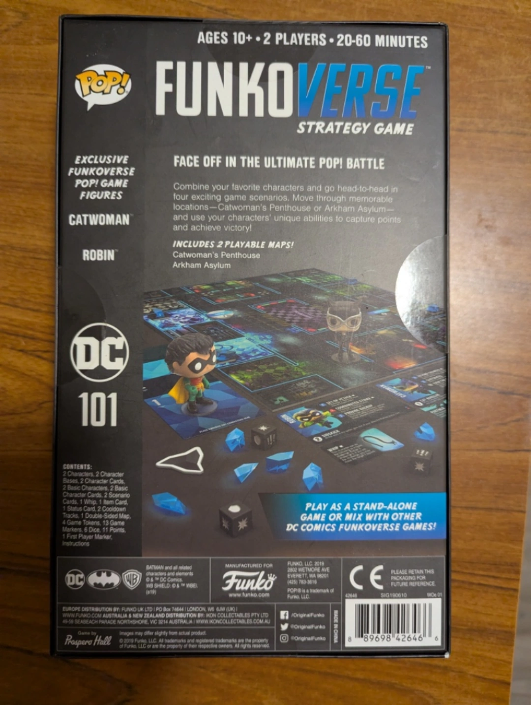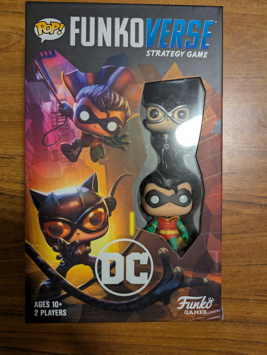 Funkoverse Strategy Game featuring Catwoman and Robin. Includes two playable characters, game board, and all necessary game components. Ages 10+, 2 players, 20-60 minute playtime. New, unopened box.