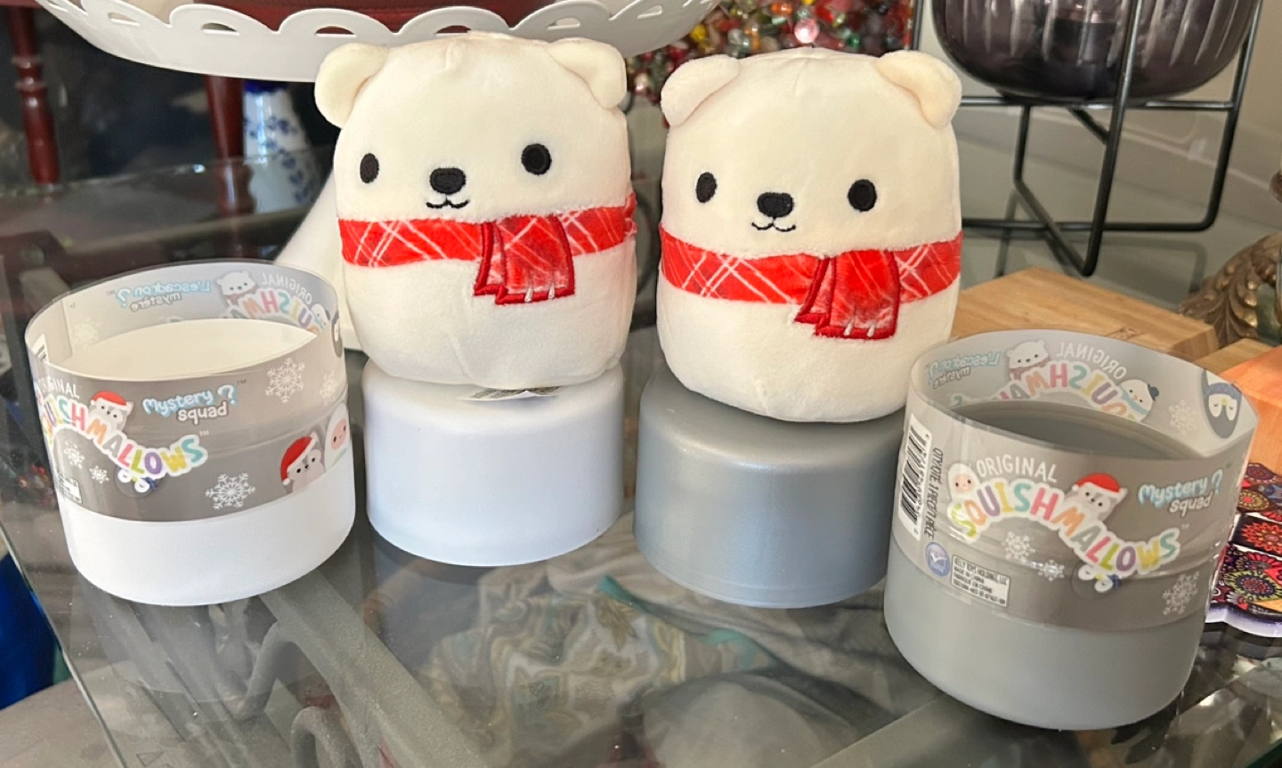 Two adorable polar bear Squishmallows. Each bear wears a red and white plaid scarf. Comes in original packaging. Collectible. $5 each 😊