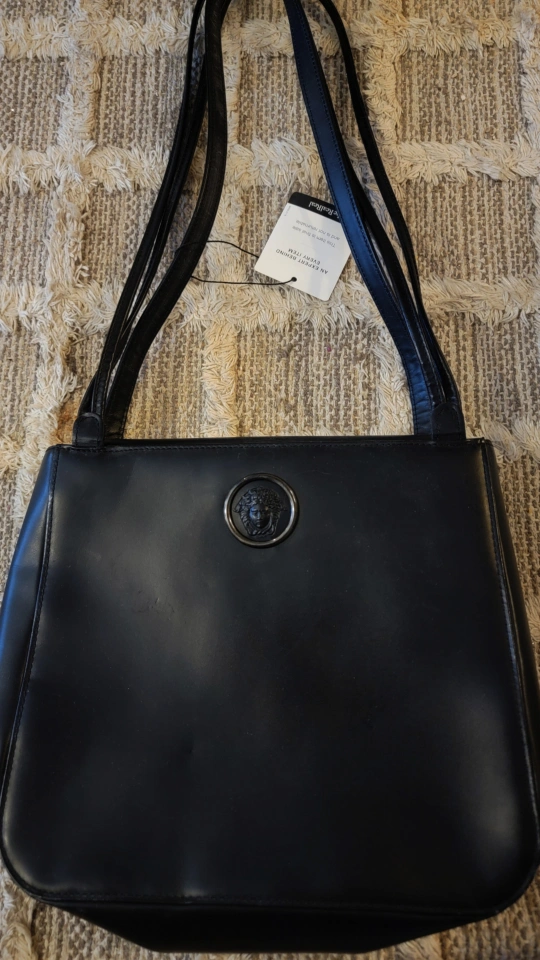 Gorgeous simple black vintage Gianni Versace handbag. Black leather. Features Medusa head emblem. Multiple straps. Zip closure. Interior lining. Made in Italy. #vintagehandbaglovers #vintageversace #gianniversace