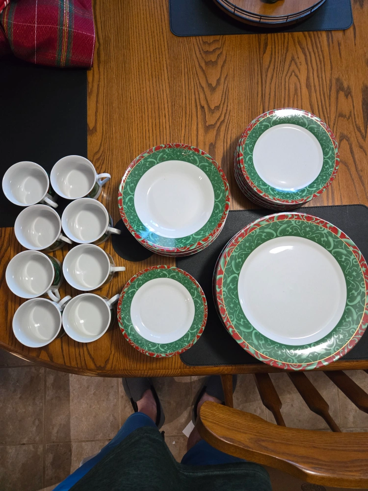 Beautiful vintage holiday dinnerware. Set includes dinner plates, salad plates, teacups and saucers. Green and red design. Perfect for Christmas gatherings.