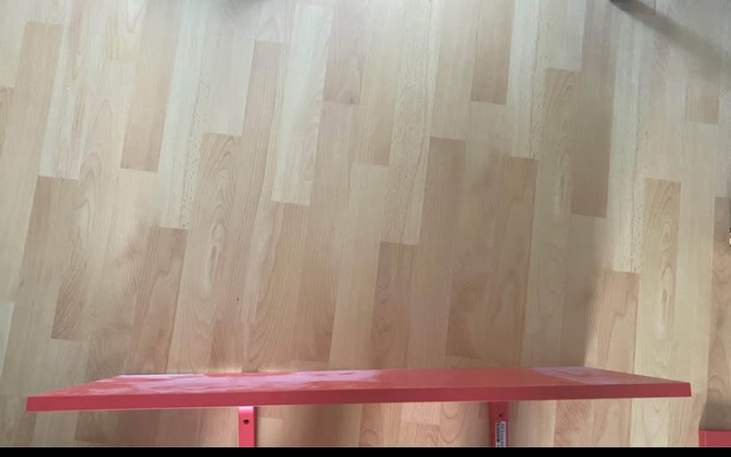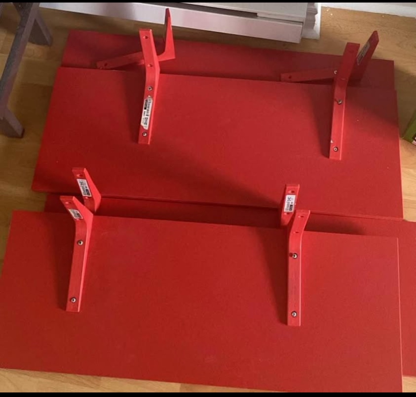 Four red IKEA floating shelves. Simple design, easy to install. Great for adding storage or display space.