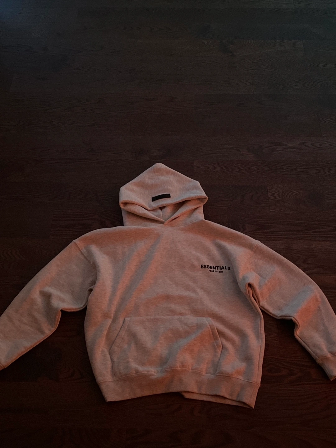 Beige coloured hoodie. Features a small logo on the chest. Long sleeves and a kangaroo pocket.