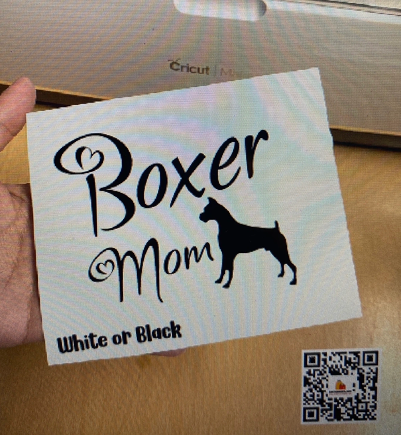 Adorable Boxer Mom decal. Features a Boxer silhouette and script lettering. Available in white or black. Perfect for car, laptop. Size 5x3 inches approx. Visit us www.ecorootstore.com