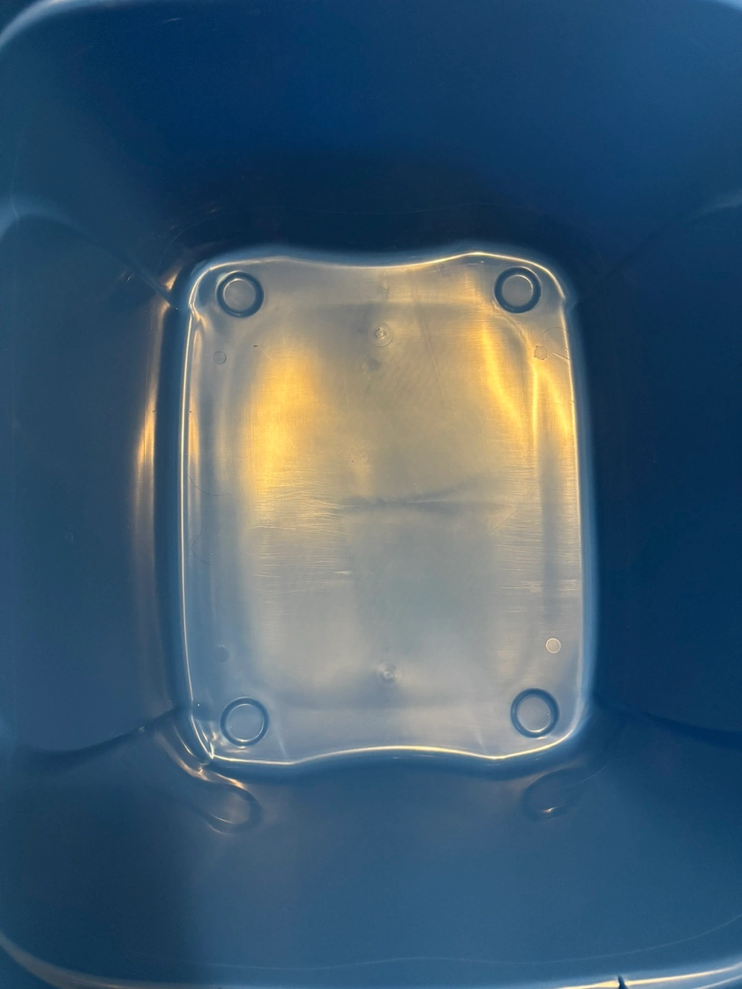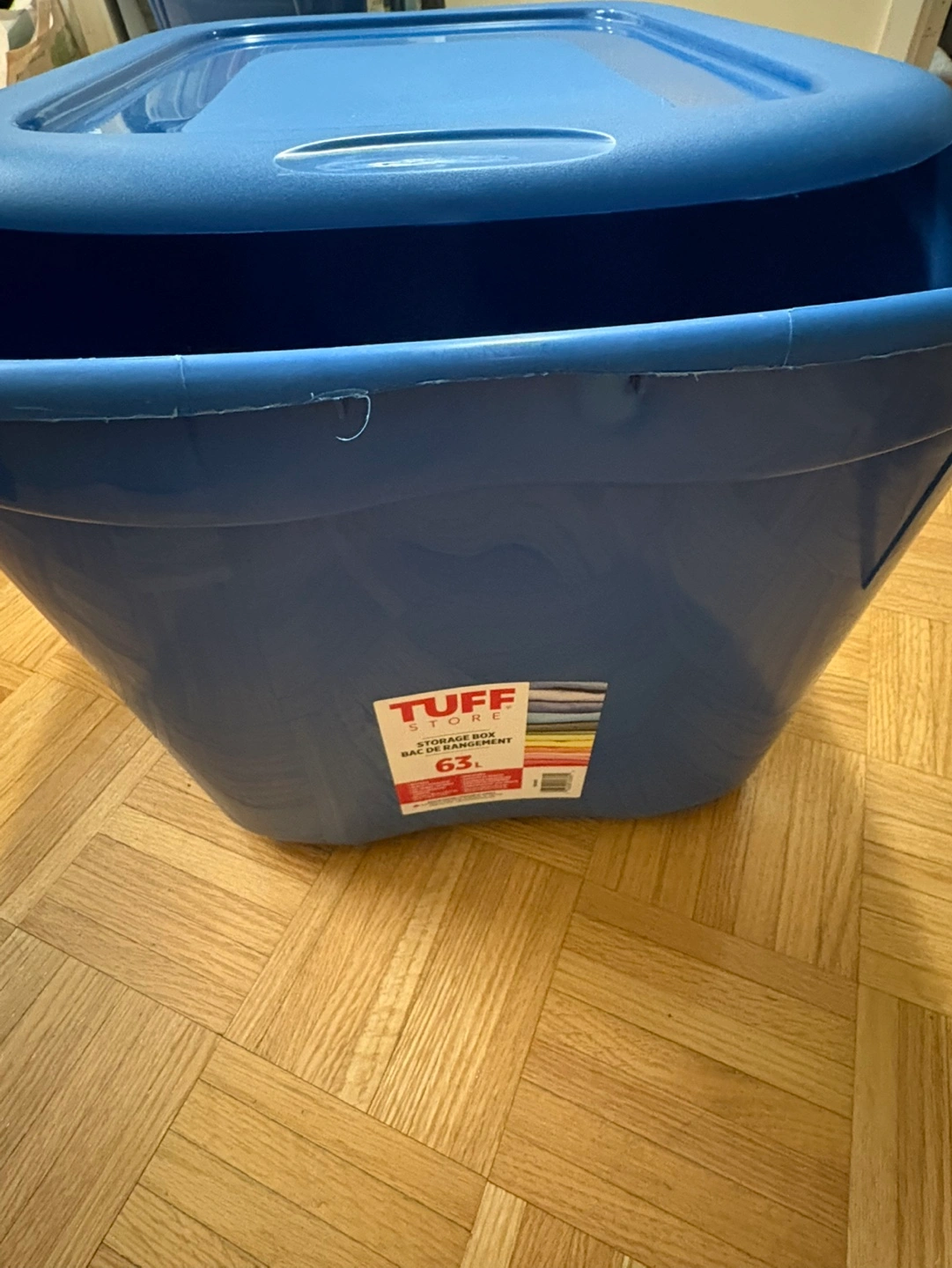 Large plastic 63L storage bin with lid. Features a hinged lid. Good for organizing and storing items.