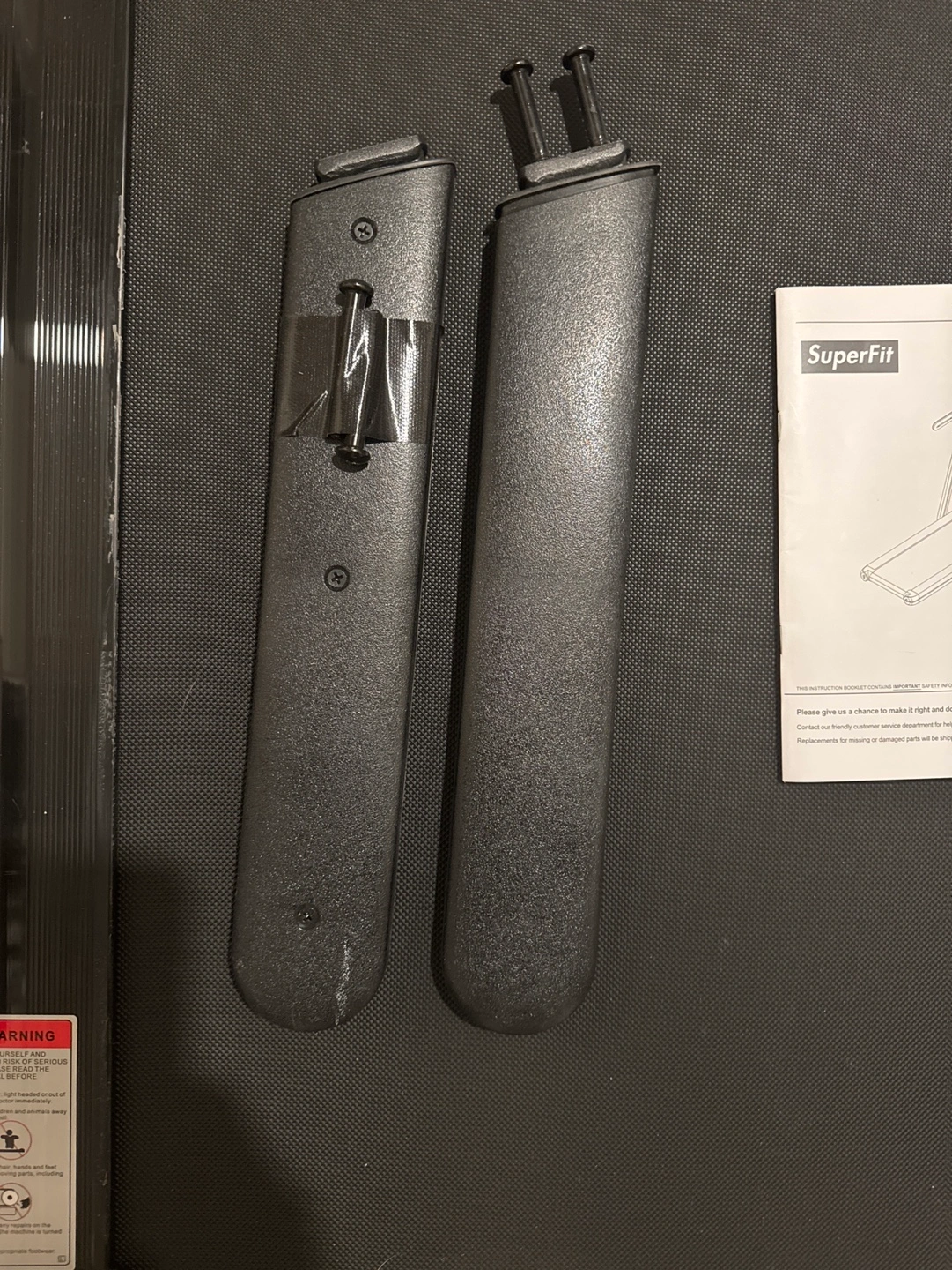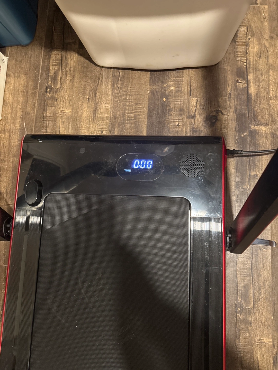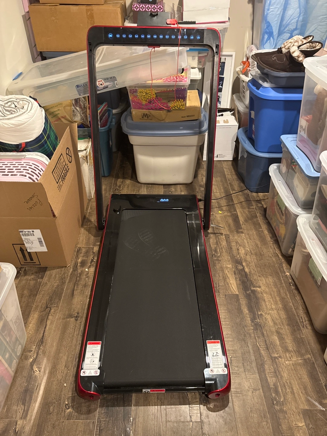 Compact foldable treadmill. Features a digital display, multiple speed settings, and safety key. Includes instruction manual. Like new condition. Comes with handles that were removed for move. Great for tight spaces as folds up for easy storage.