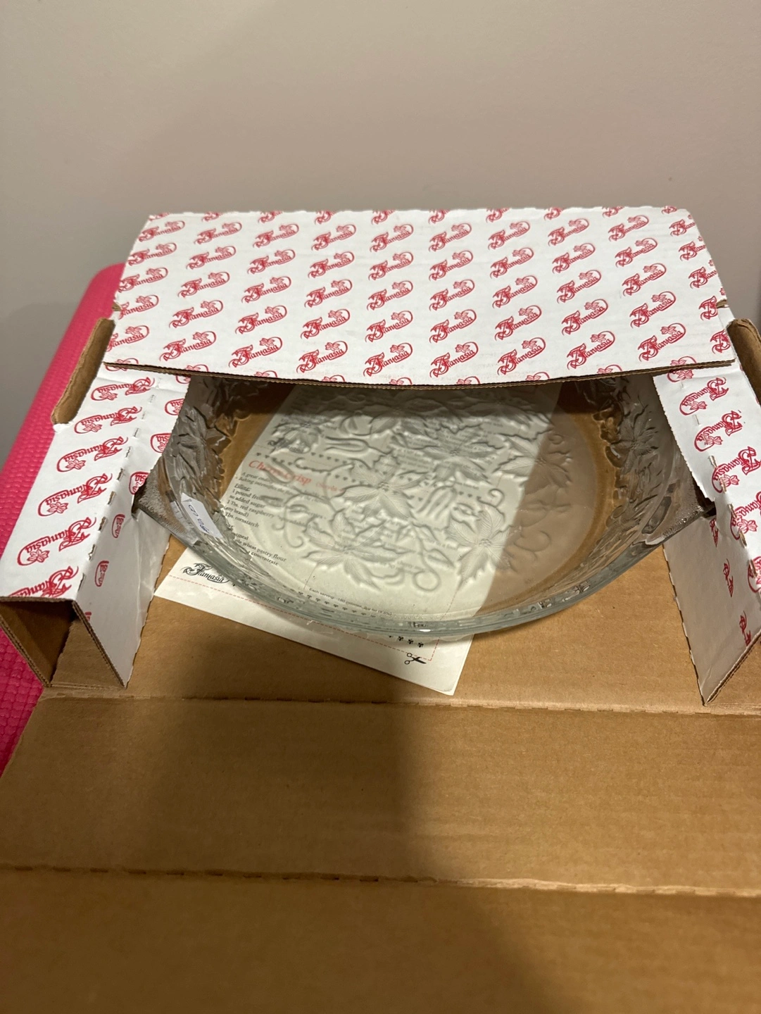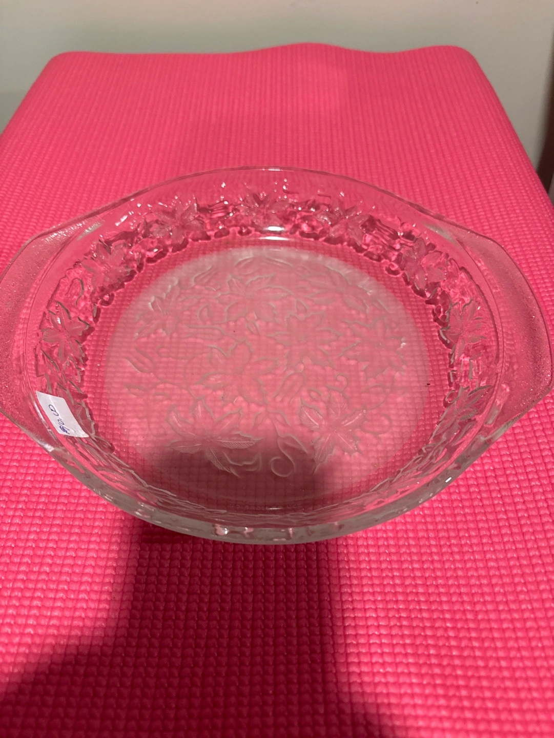 Beautiful Princess House Fantasia pie plate. Clear glass with an etched floral design. Includes original box. Excellent condition. Brand new.