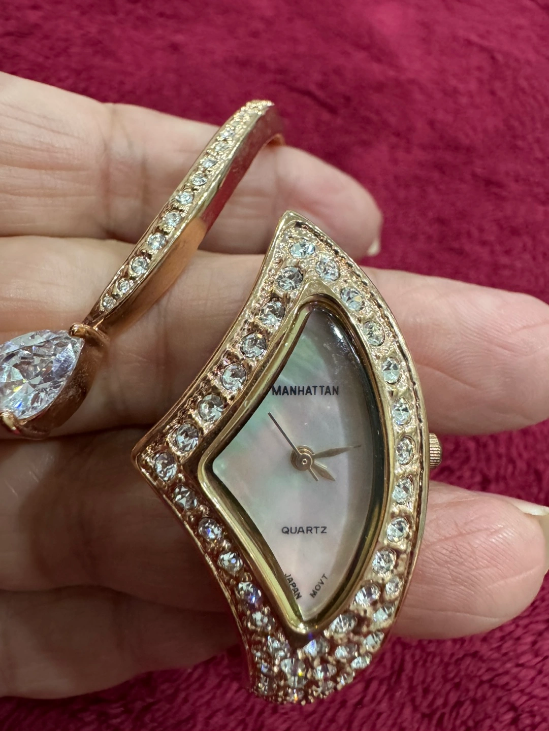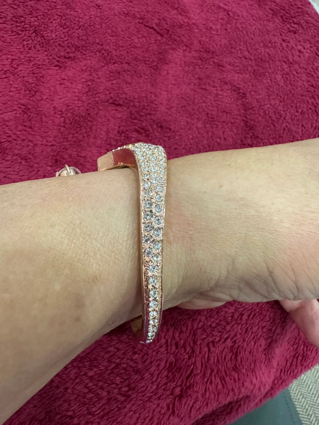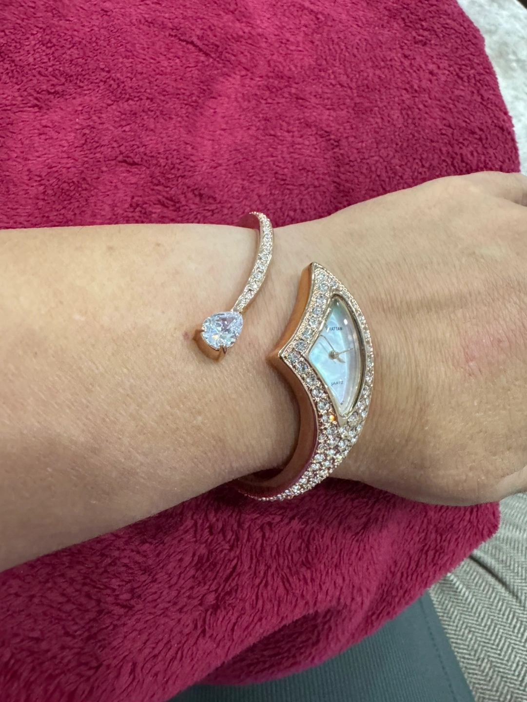 Rose gold-toned watch and bracelet set. Features a unique curved design, adorned with sparkling crystals. Quartz movement. Elegant and eye-catching.