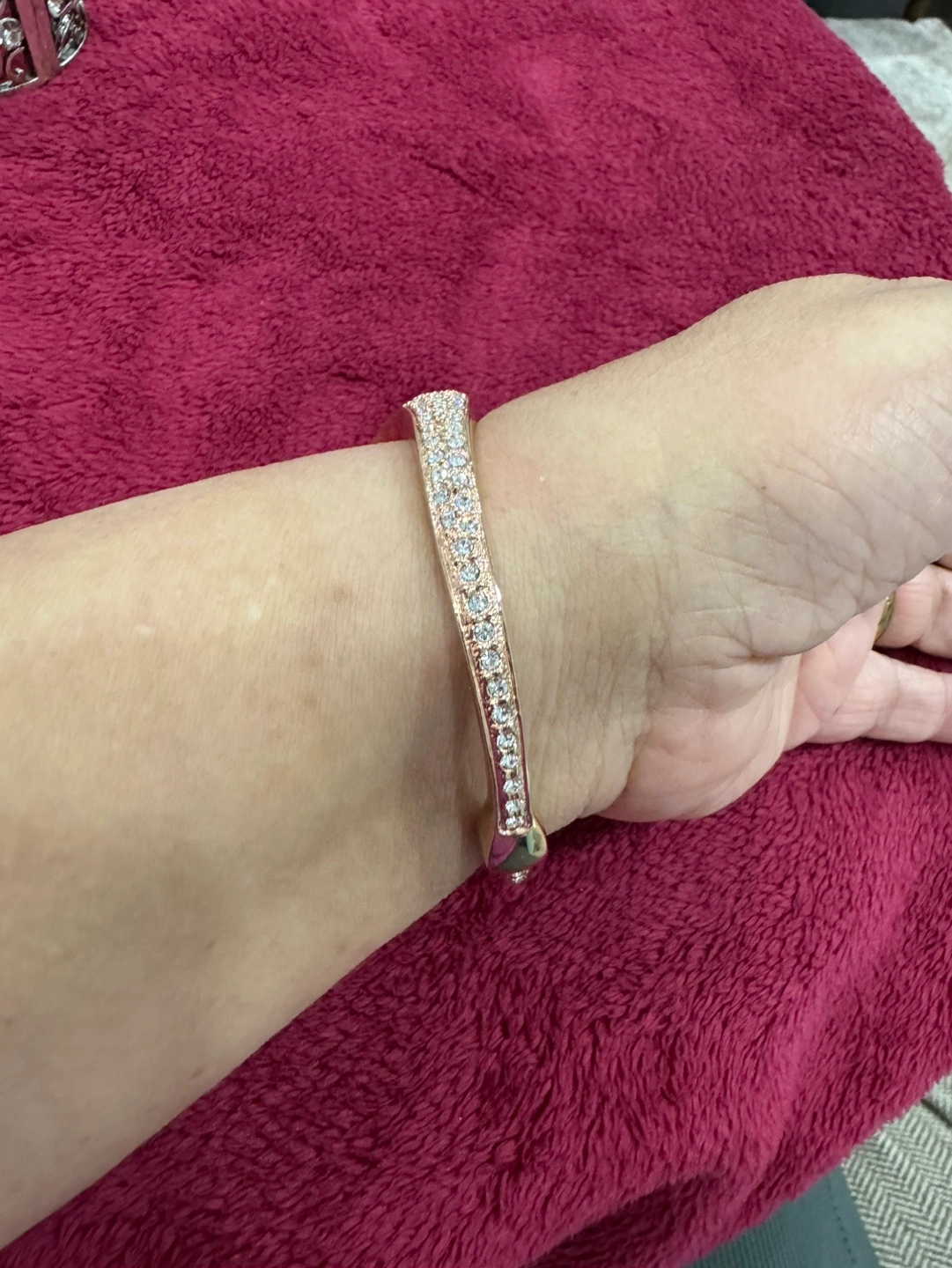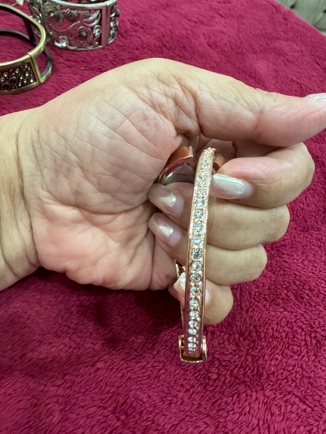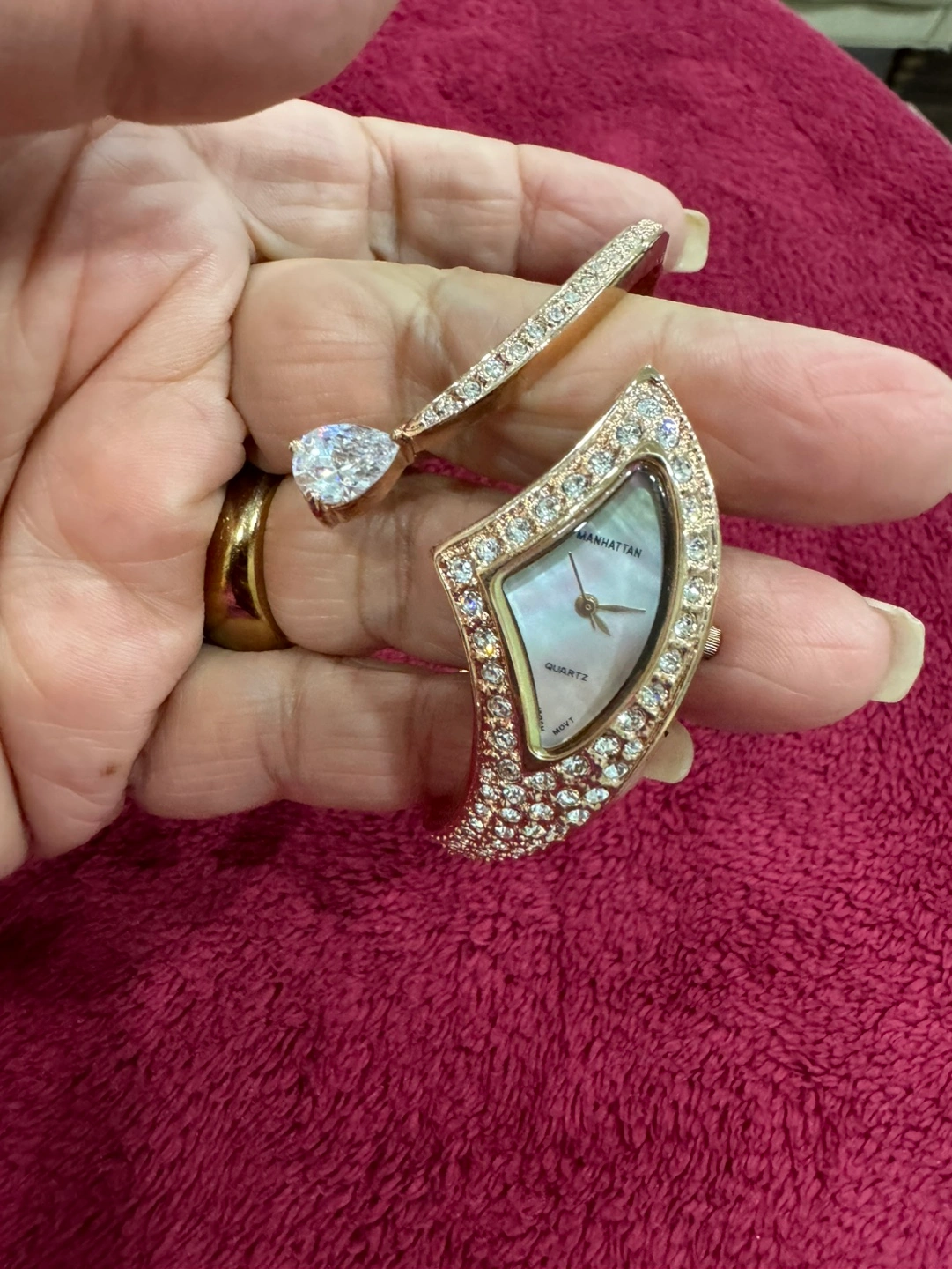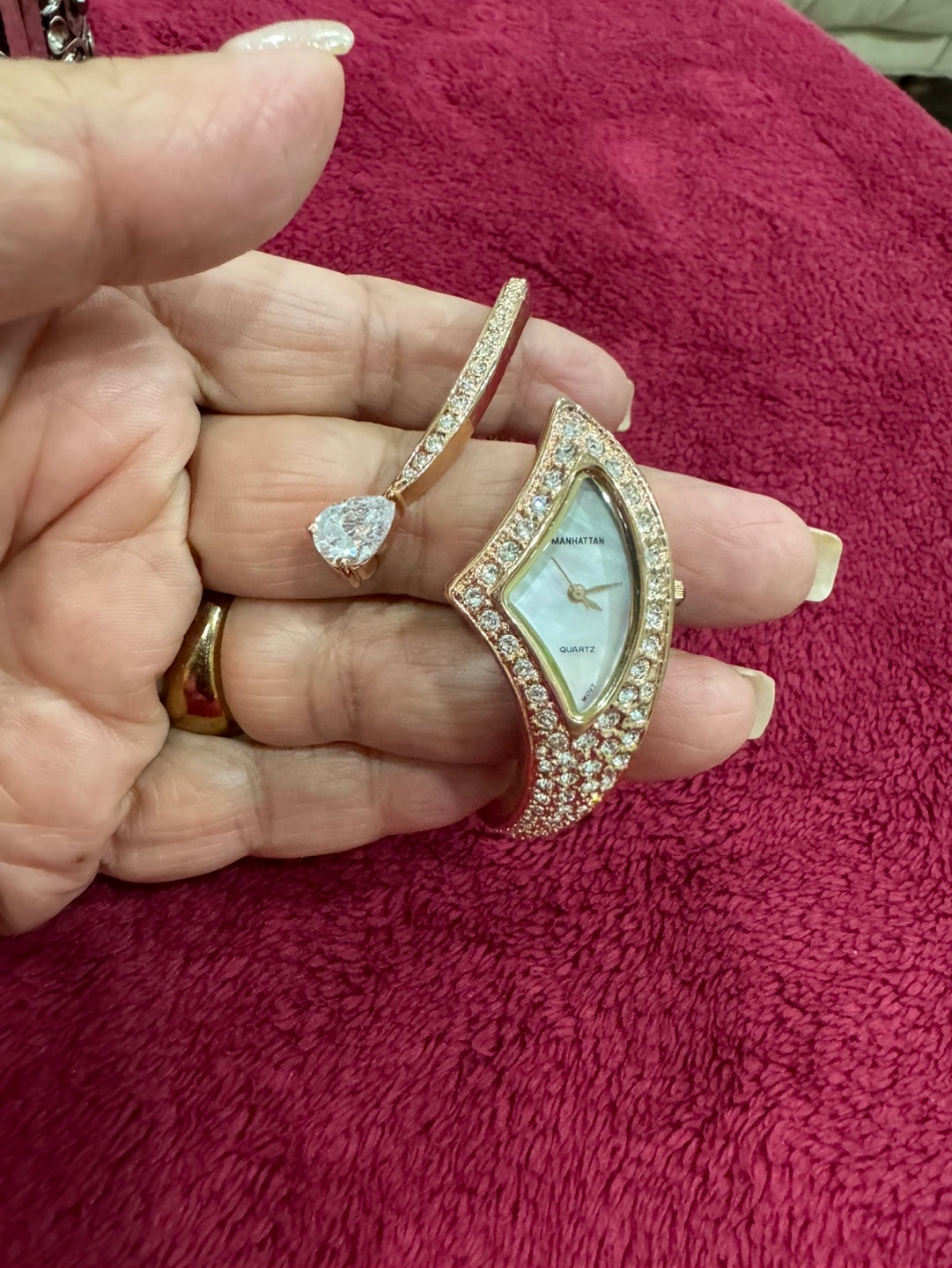 Rose gold-toned watch and bracelet set. Features a unique curved design, adorned with sparkling crystals. Quartz movement. Elegant and eye-catching.