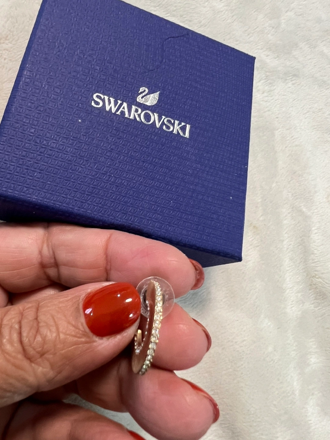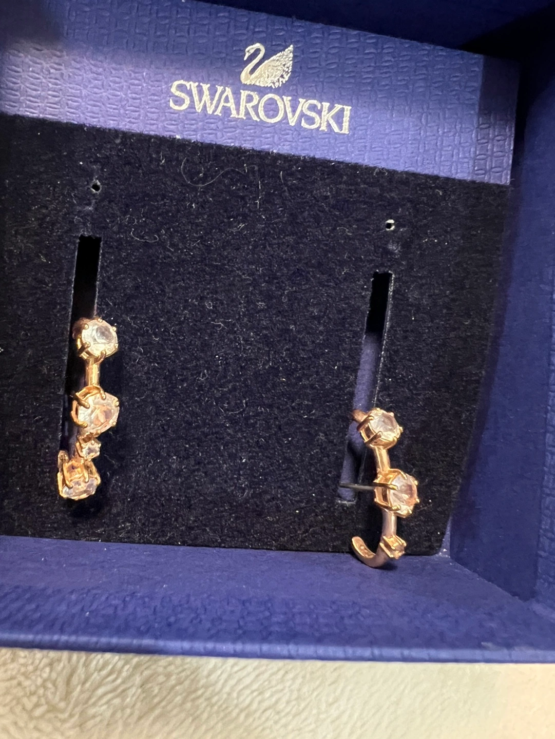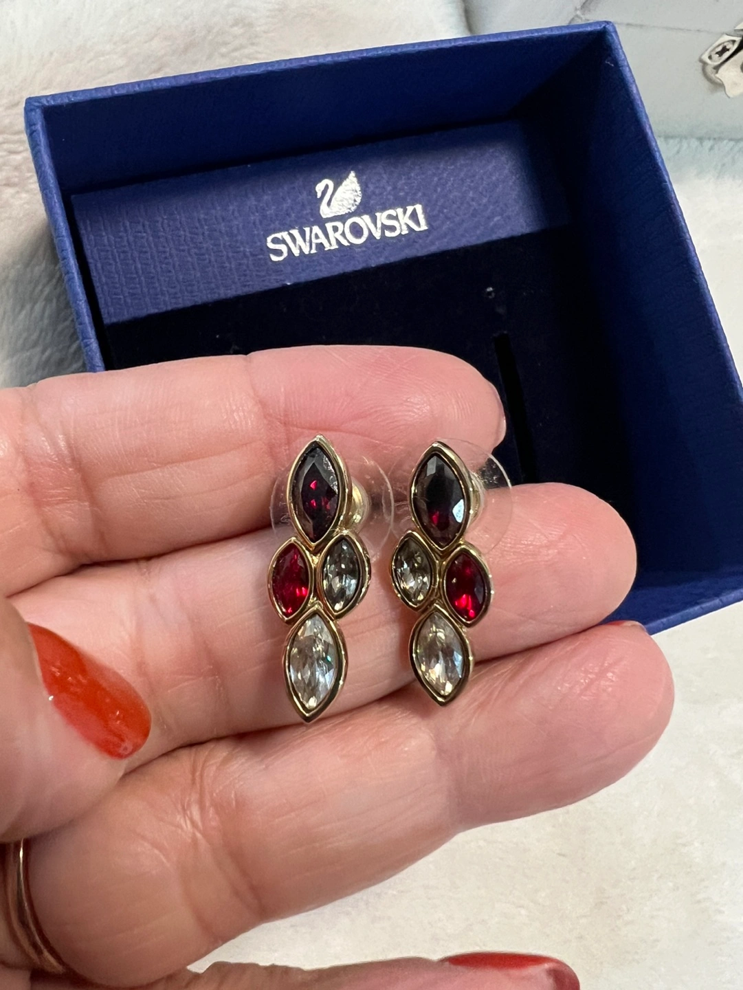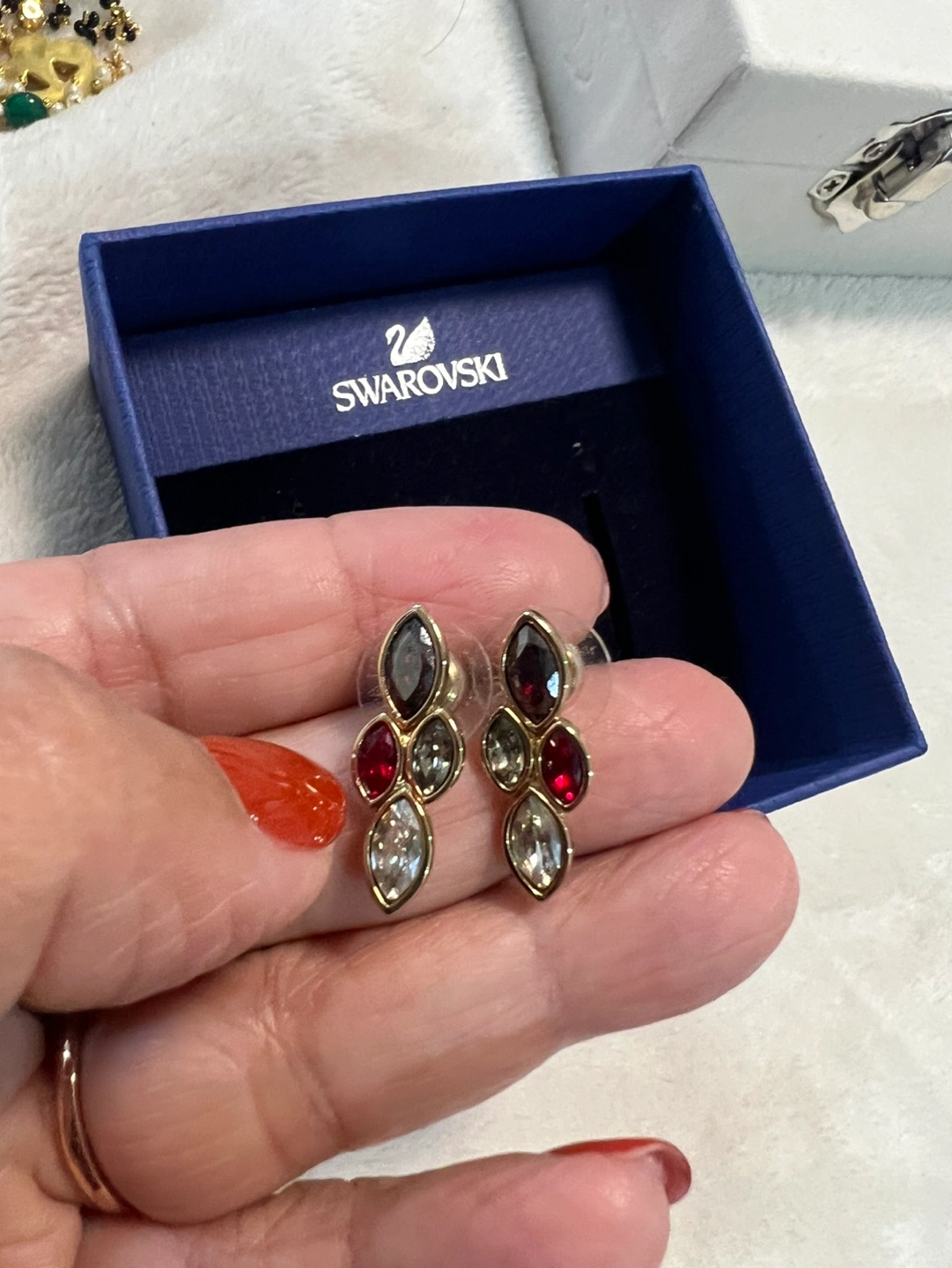 Three pairs of Swarovski earrings. Rose gold tone metal. Clear and coloured crystals. Various styles. Excellent condition. Sold as a bundle.45$ each
