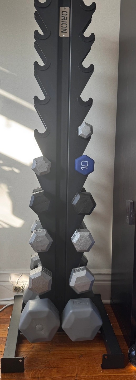 1910 pair weight rack. Very good condition. Designed for 5-50lb dumbbell set Weight 50lbs Weight capacity 550lbs Assembled dimensions (LxWxH) 20” x 20” x 62” Does not include weights Pick up Toronto