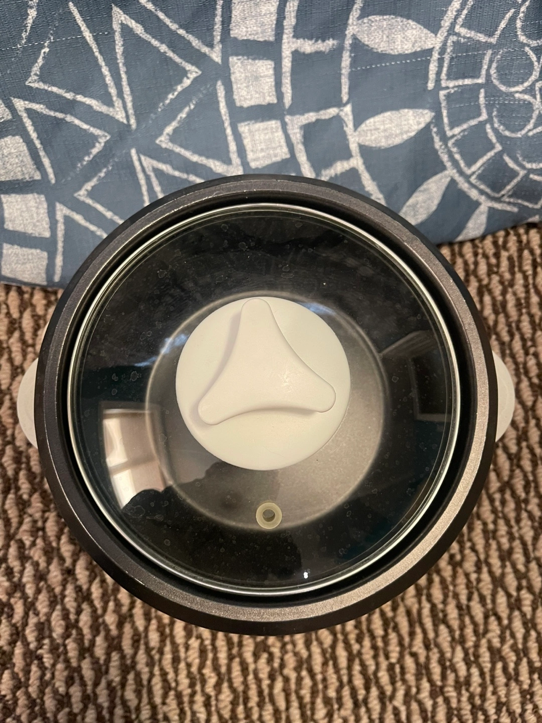 Small electric rice cooker. Features a non-stick inner pot and a simple cook/warm function. Includes power cord. Good for small portions. used very little.