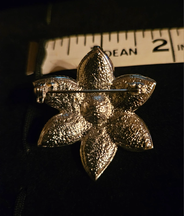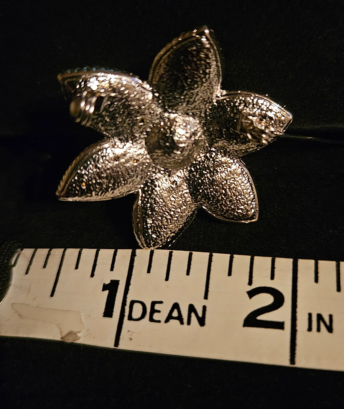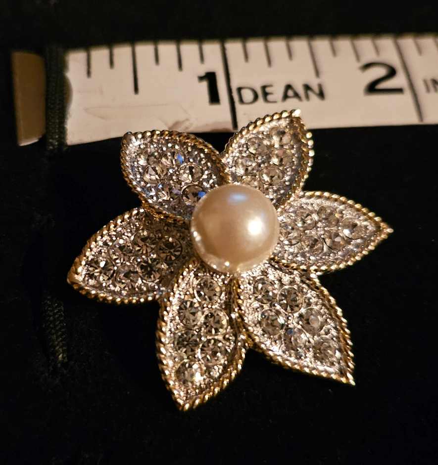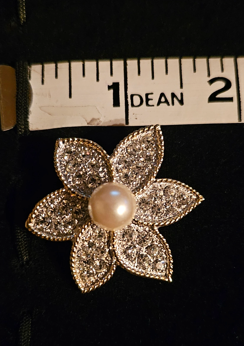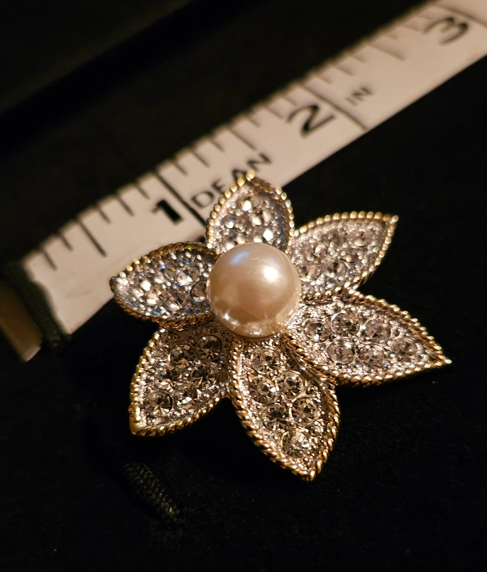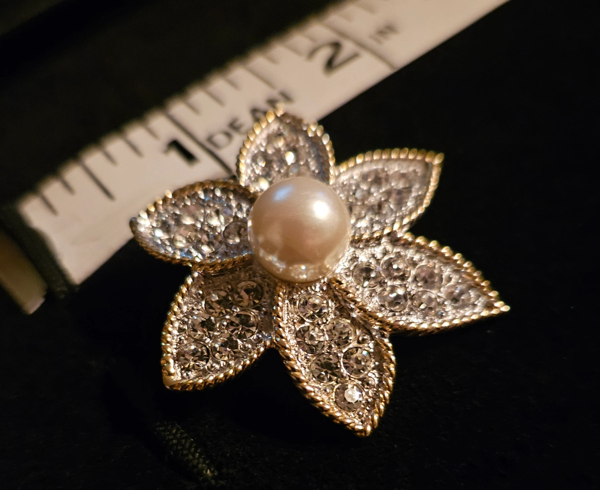 This is a simply fabulous little rhodium-plated vintage flower brooch, adorned with crystal diamanté on the six petals and a large faux pearl right in the centre.