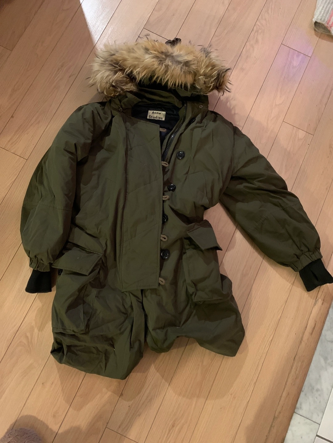 Olive green parka. Features a fur-trimmed hood and multiple pockets. Long sleeves with ribbed cuffs. Down-filled for warmth.