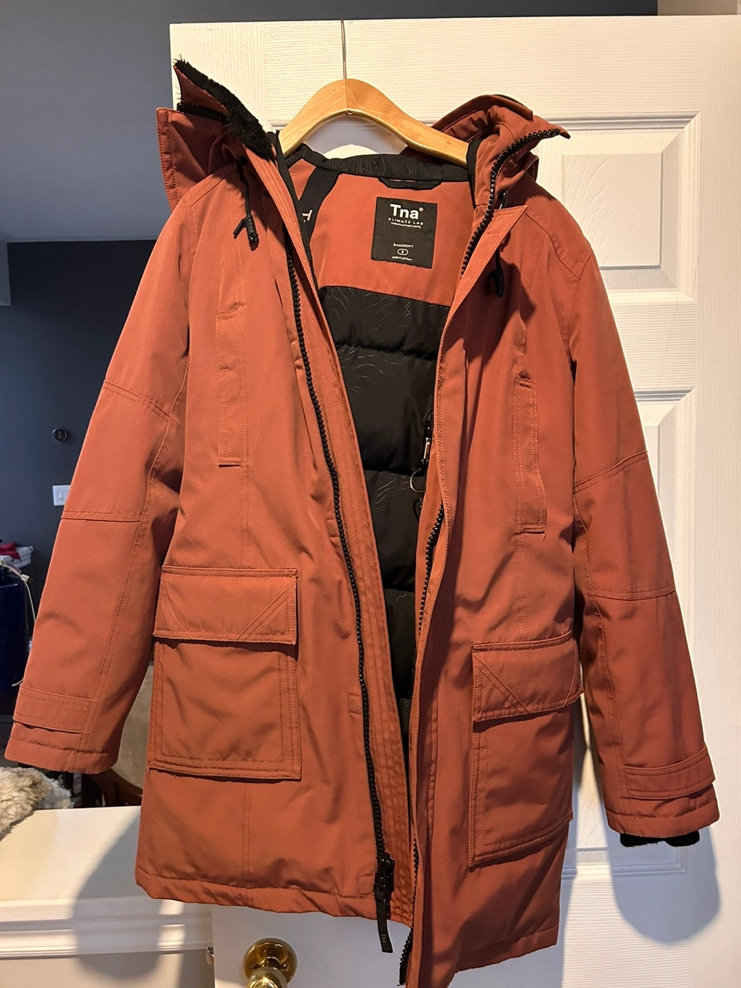 16TNA Aritzia Bancroft Parka Winter Jacket, Size Small but can fit XS. Colour is Rust ( more of rich colour not too bright) . Extremely warm, detachable fur hood. Features a hood, zip closure, and multiple pockets. It’s in good condition. Some sign of wear on the magnetic closures if you look closely but hardly noticeable. No low ball offers. Pick up Walkers line and Dundas, Burlington. We can also meet somewhere in Brampton on Saturdays.