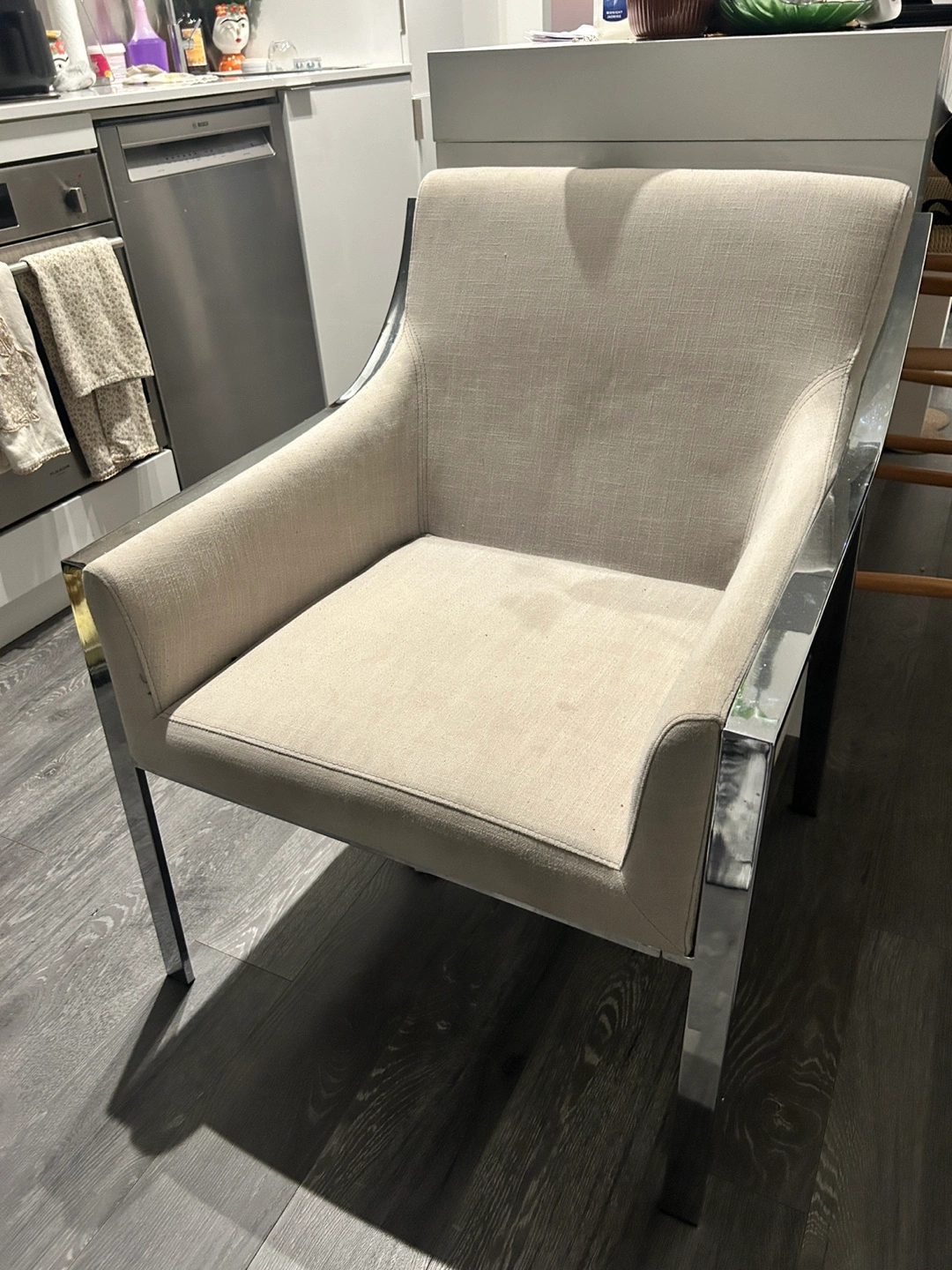 Stylish accent chairs. Neutral linen fabric upholstery. Sleek chrome legs. Great addition to any living space.