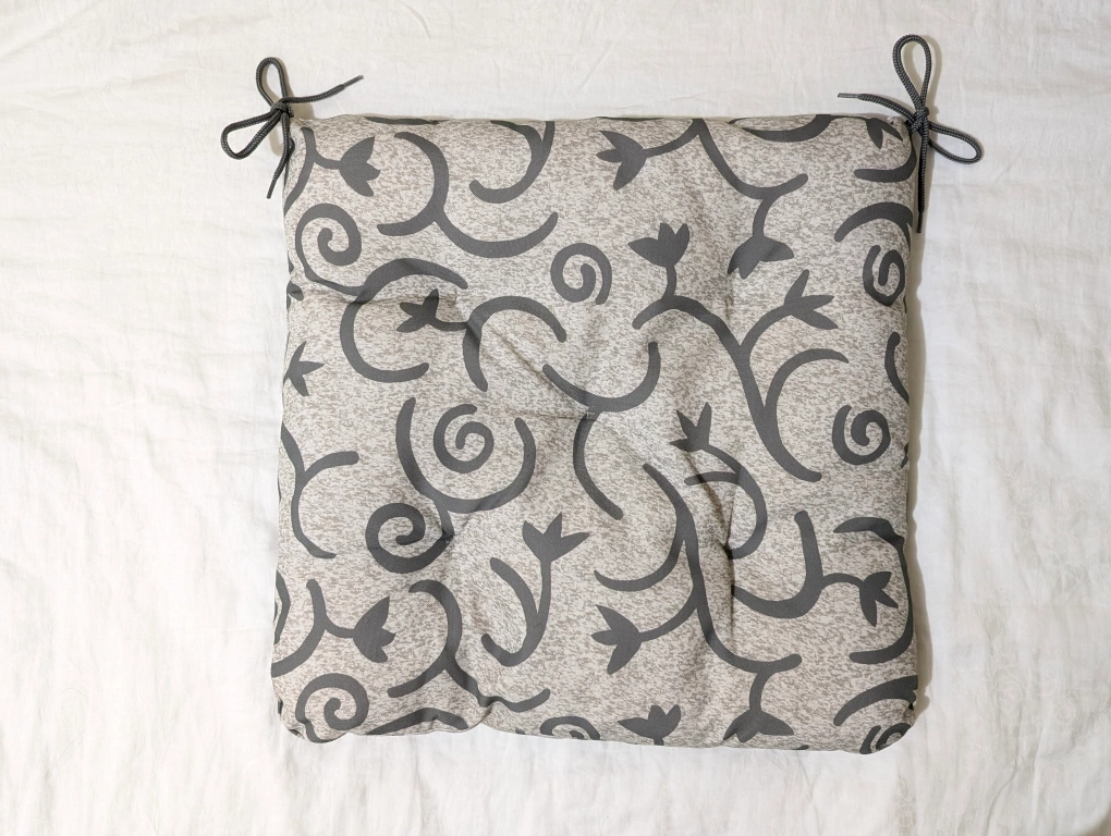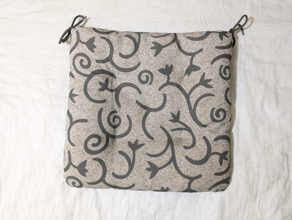 Comfortable chair cushion. Features an olive green floral pattern. Includes ties for securing to chair. Suitable for indoor or outdoor use.