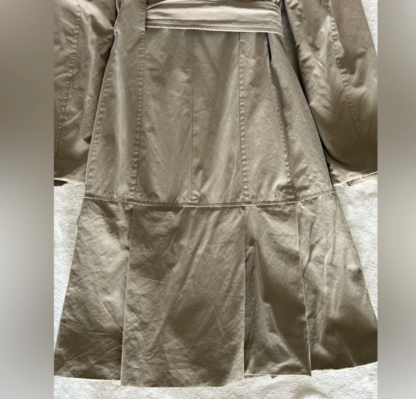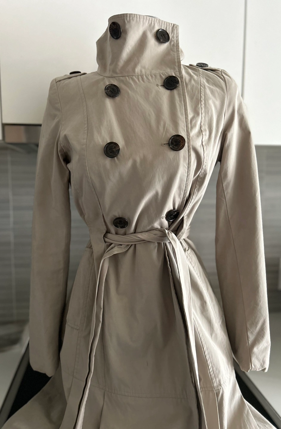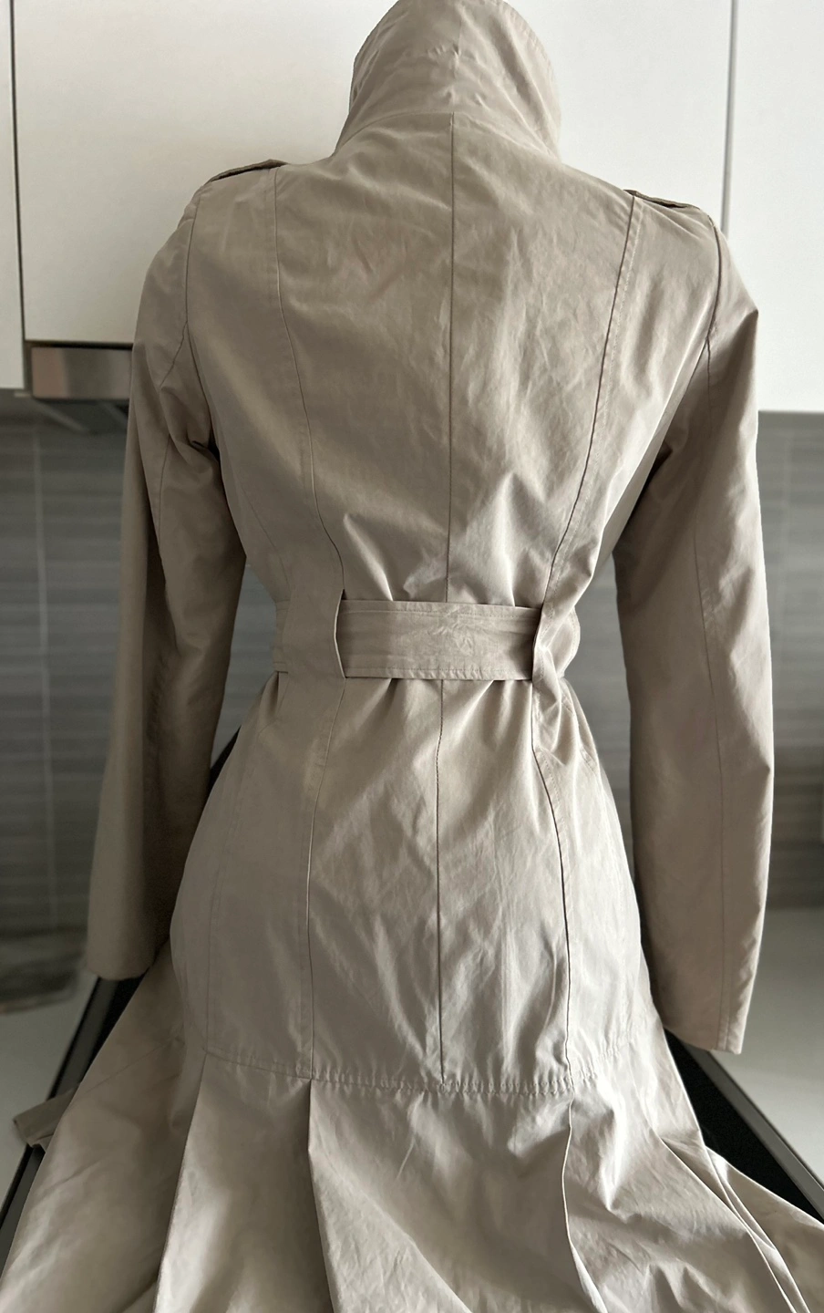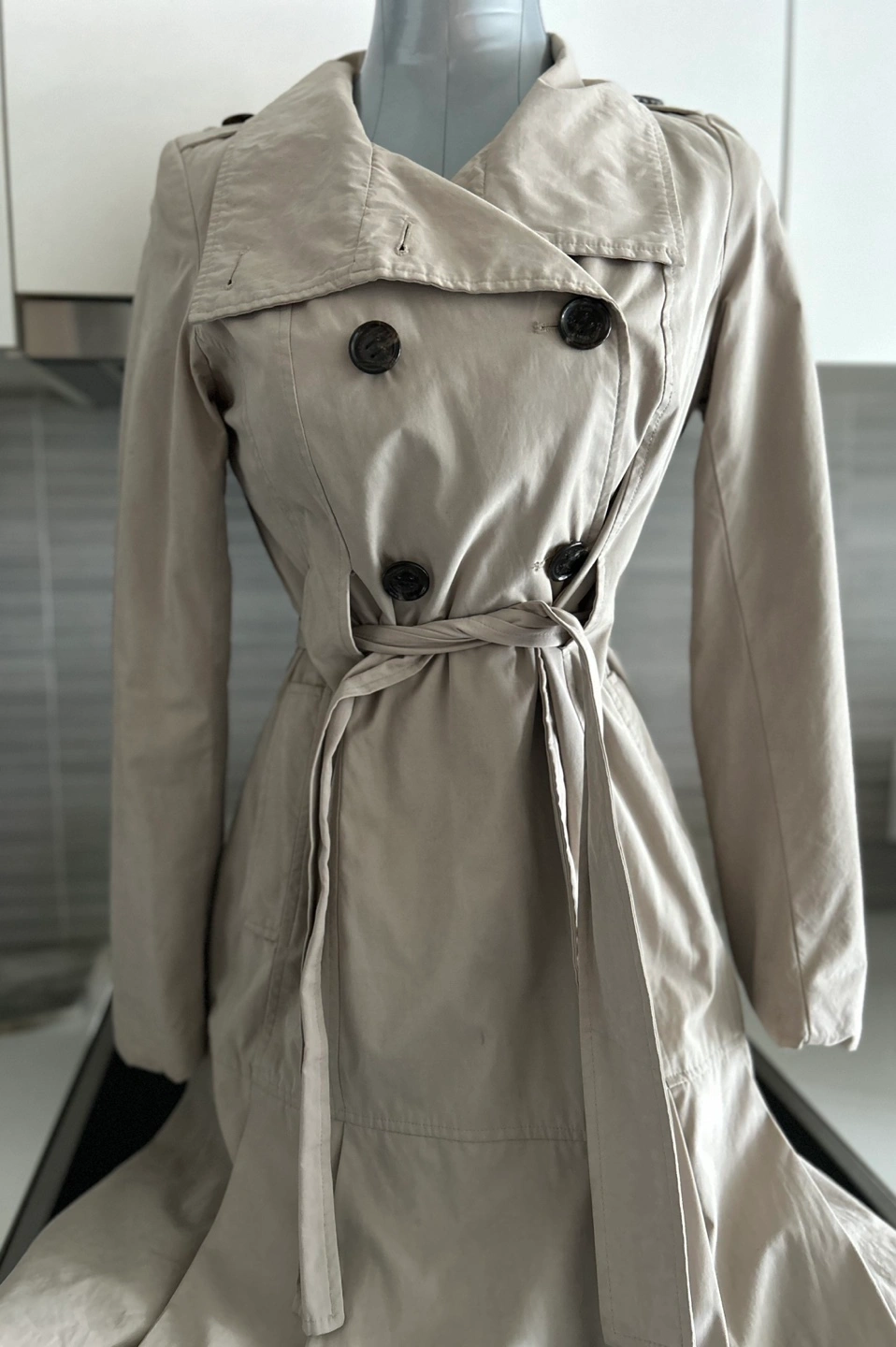 Women's beige trench coat. Double-breasted design. Features a belt. Long sleeves. A-line shape. Nice for spring or fall. Waterproof. Side pockets.