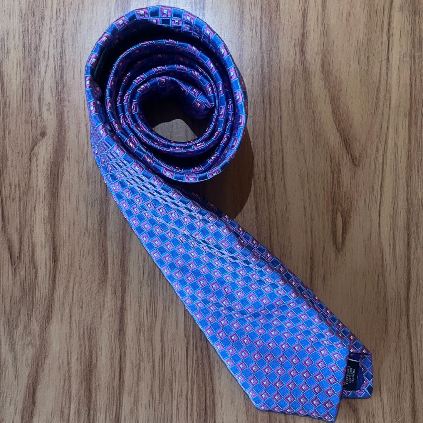 Men's necktie. Purple and blue geometric pattern. 100% Italian silk. Made in USA. Excellent condition. Pick-up near Yonge and St Clair, or I can meet along TTC Line 1.