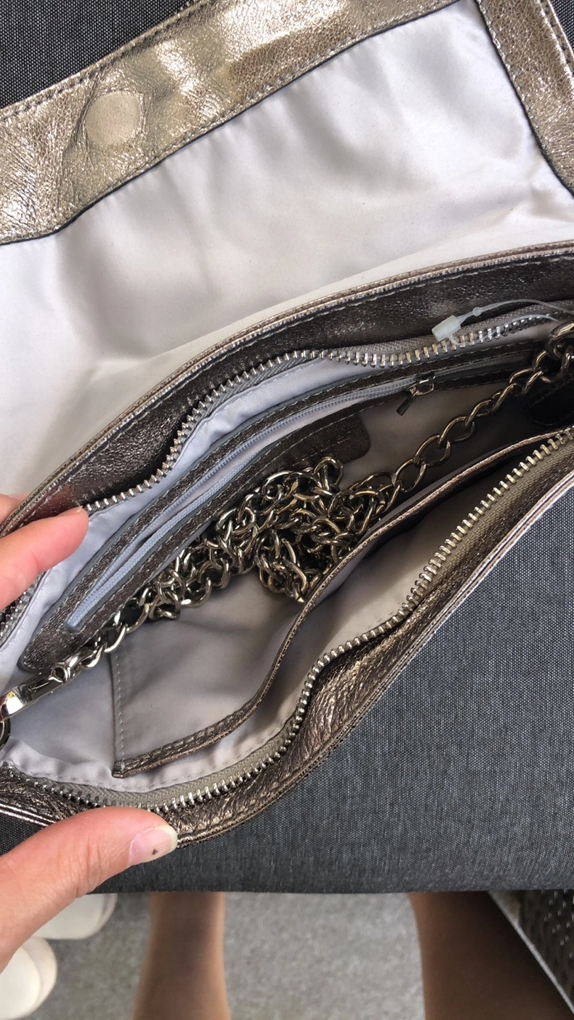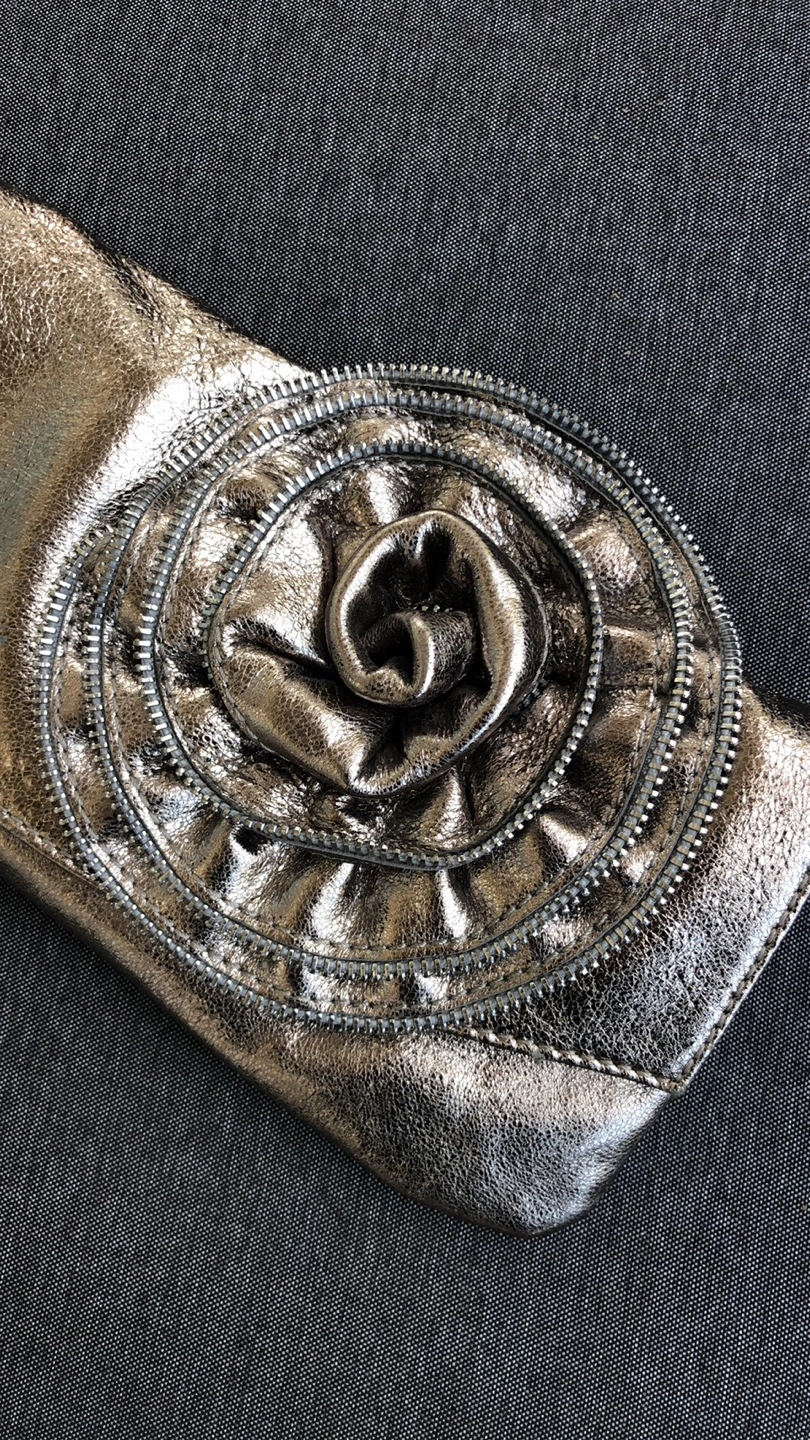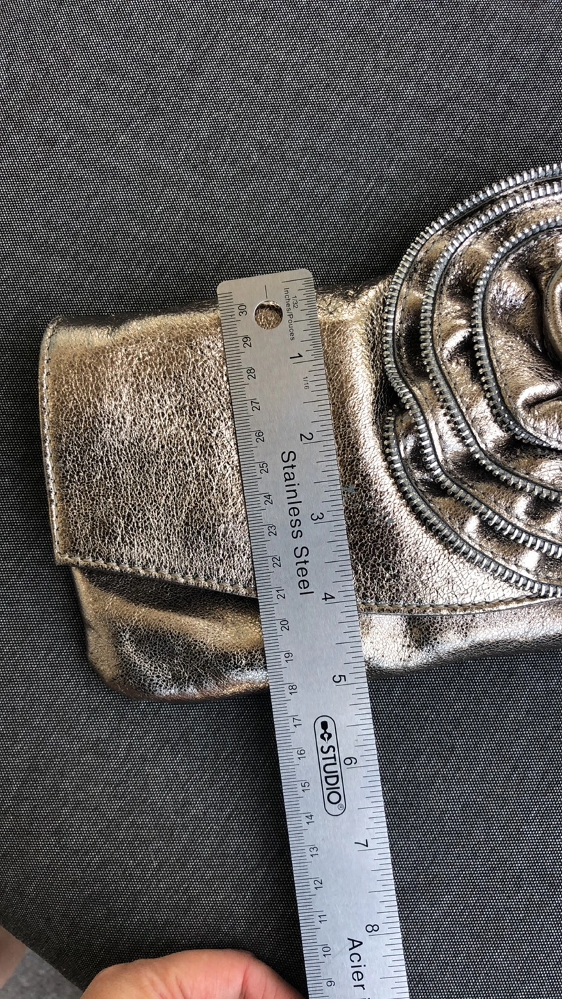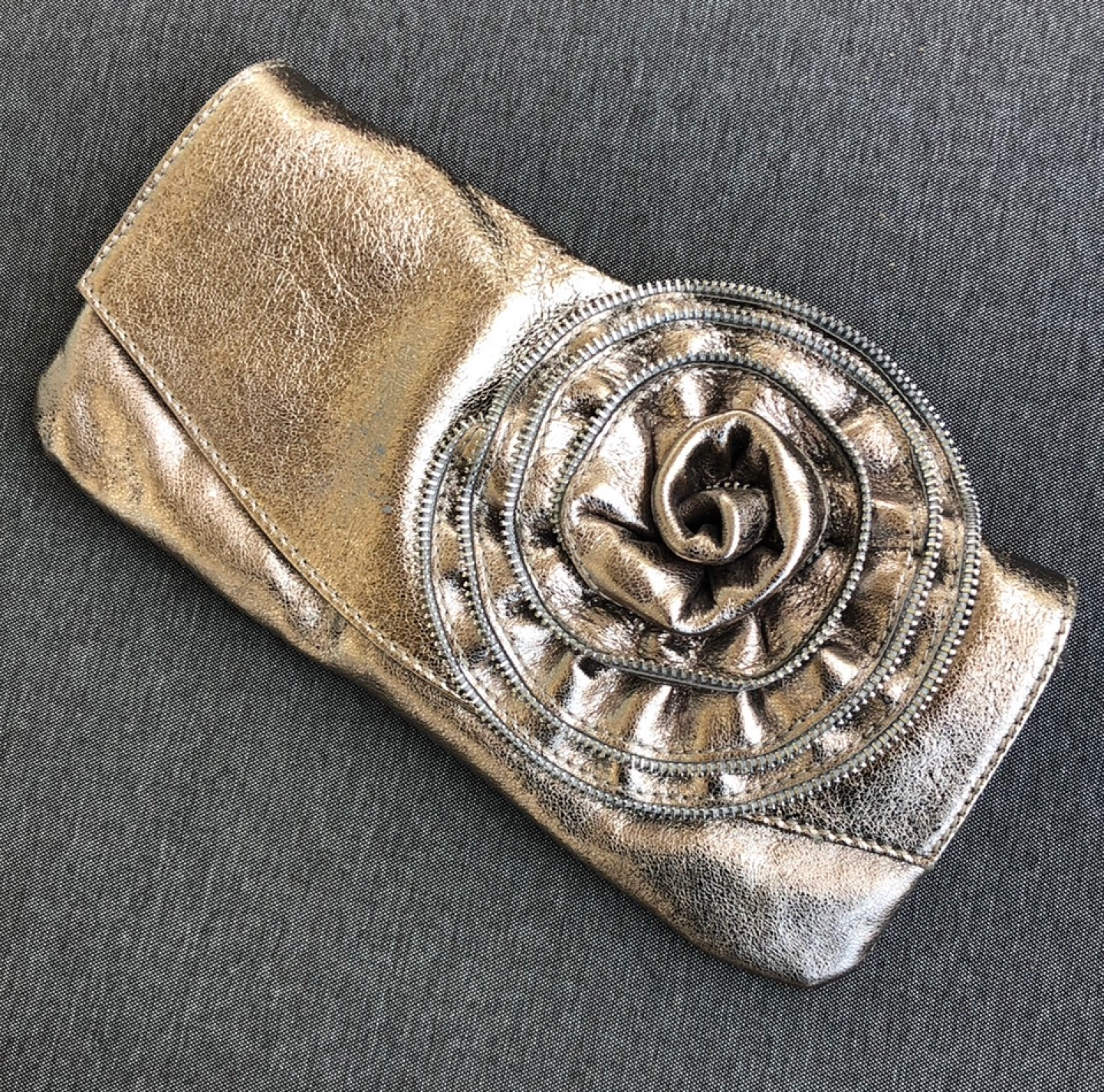 Gorgeous metallic clutch. Features a unique rose detail. Zipper closure. Interior pockets. Detachable chain strap. Great for evenings out.