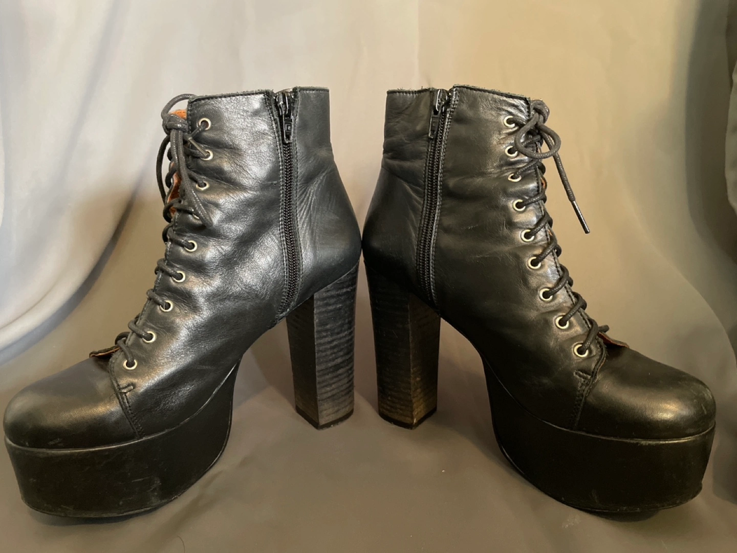 Women's black leather platform boots.