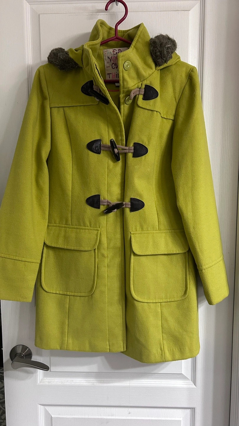 Women's lime green wool blend coat. Features a faux fur lined hood and toggle closures. Good condition, minor wear. Size medium.