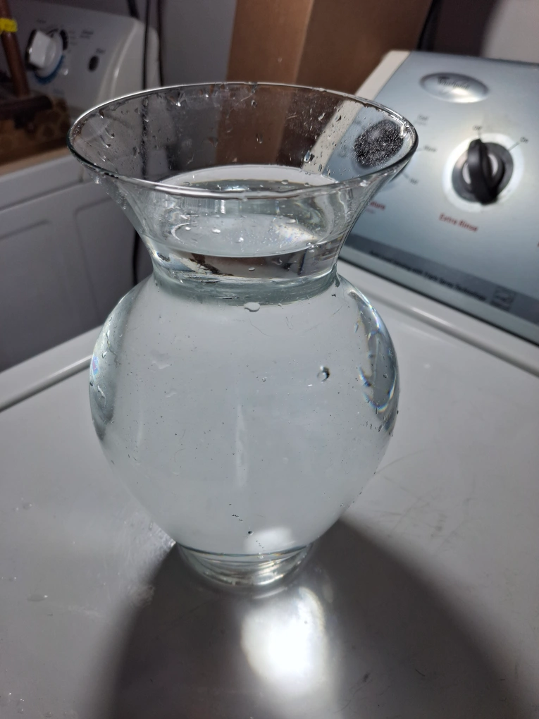 Beautiful clear glass vase. Unique shape. Perfect for displaying flowers or as a decorative piece. Water added for demonstration purposes only.