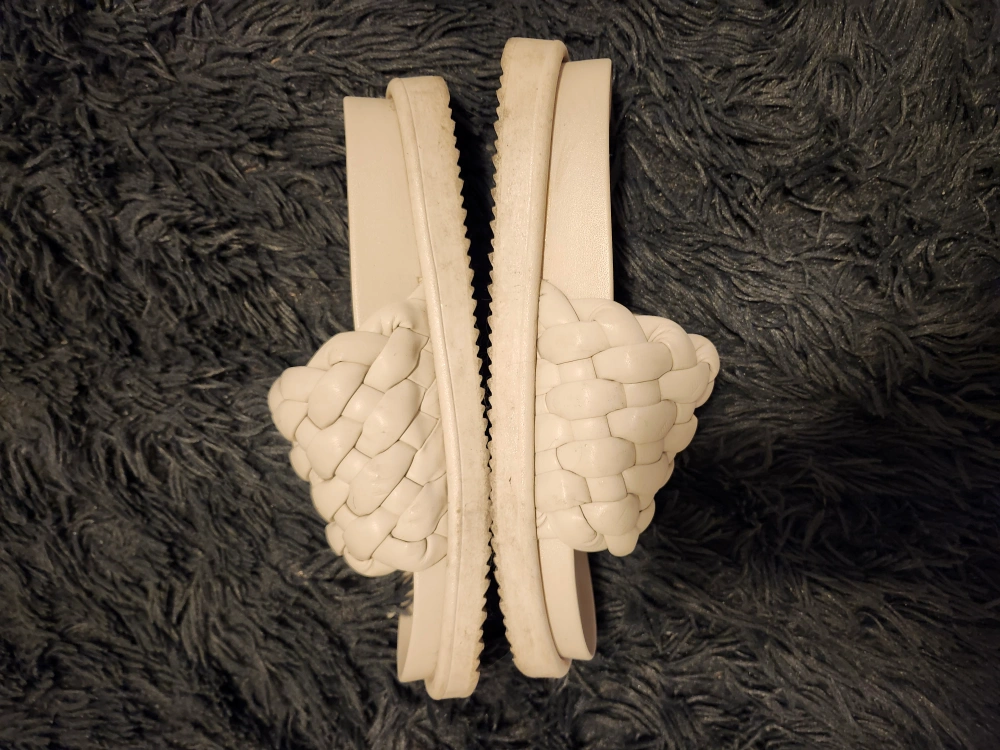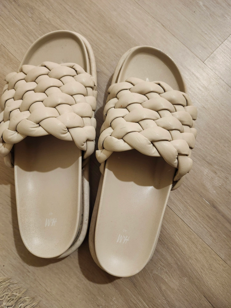 Cream-coloured woven platform slides. Open-toe design. Comfortable and stylish. Good for summer. Still in good condition.Has some dark stains on the sides.