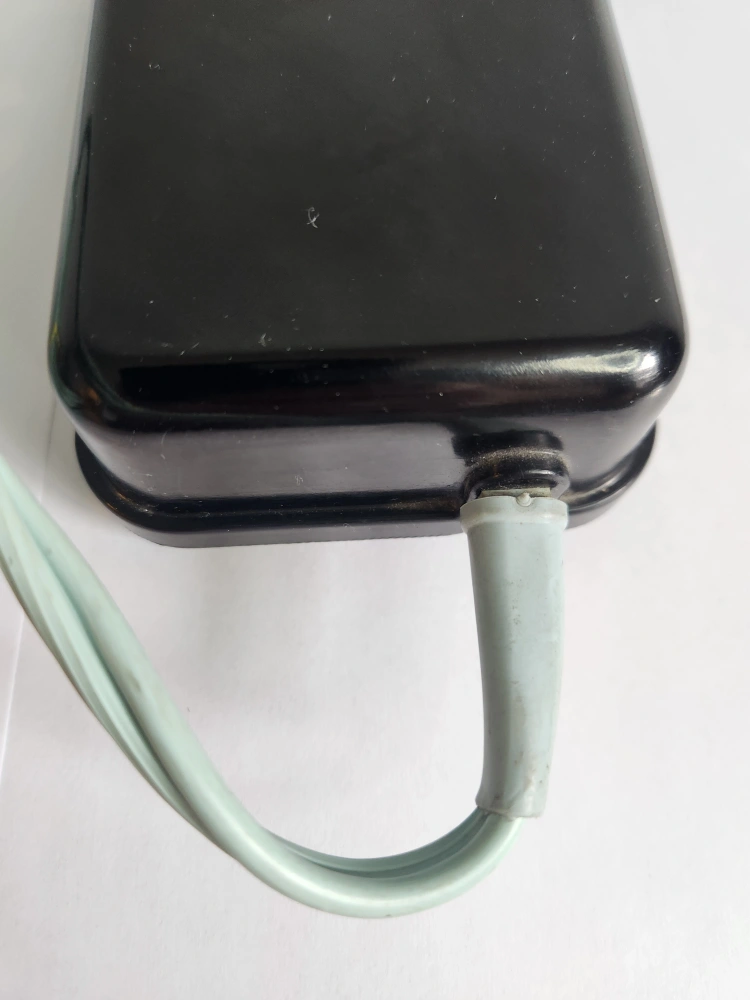 Vintage Singer sewing machine foot pedal. Black Bakelite casing. Features a speed control knob. Part number 894301-015. Includes power cord. Made in Canada.