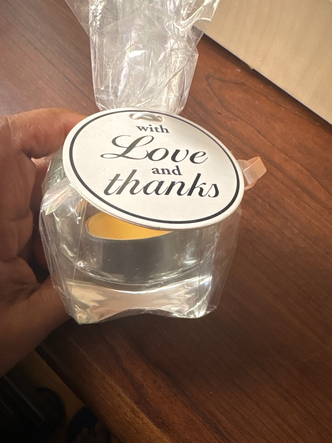 Small glass candle in cellophane packaging. Features a round tag that says "With Love and Thanks". Two available please DM for pickup location