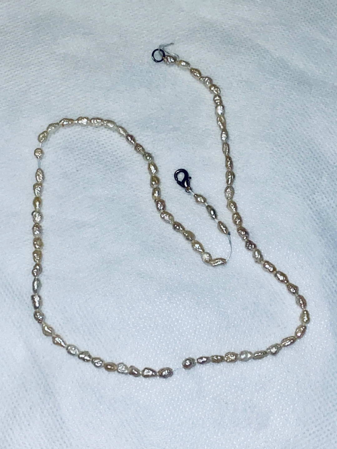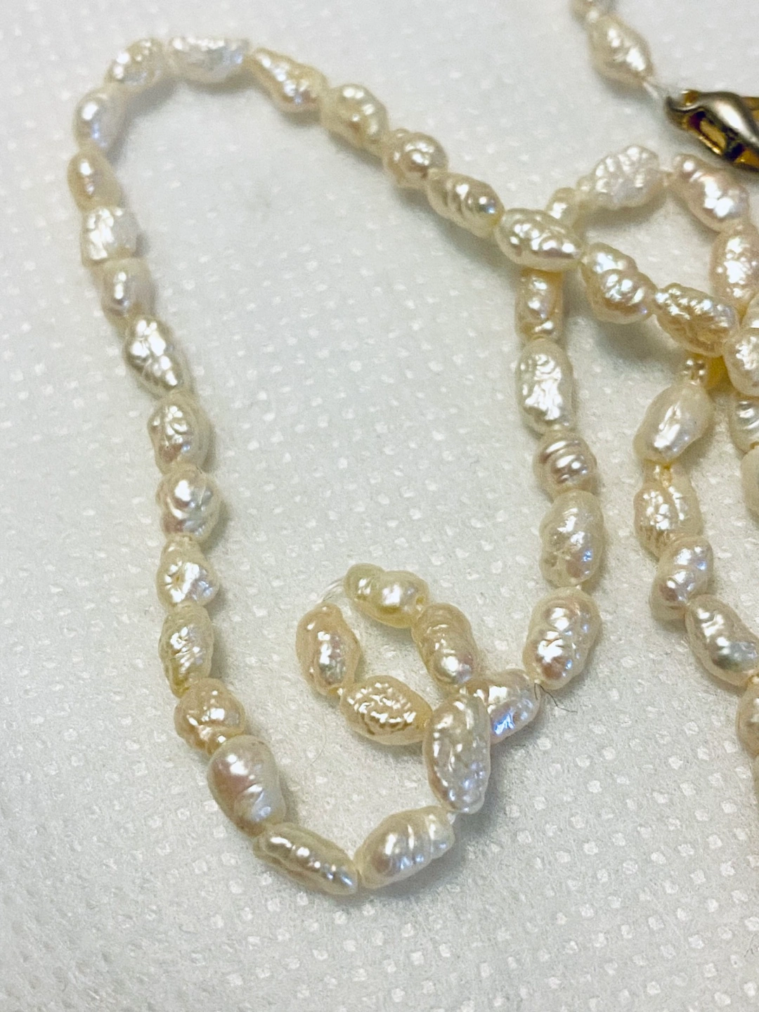 Lovely necklace featuring small, irregular rice-shaped pearls. Simple clasp. Subtle and elegant.