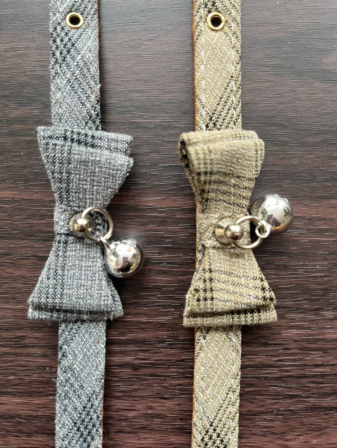 Two adorable pet collars. Grey/beige and grey/blue plaid fabric. Features removable bowties and jingle bells. Adjustable sizing from 20cm to 28cm.