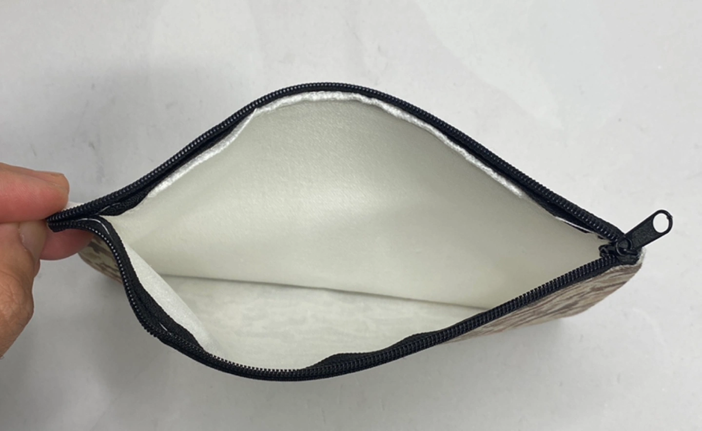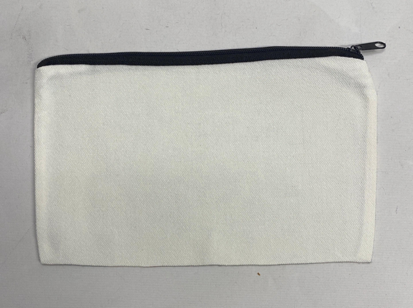 Cute zipper pouch. Features a dachshund print. Canvas material. Black zipper. Great for storing small items.