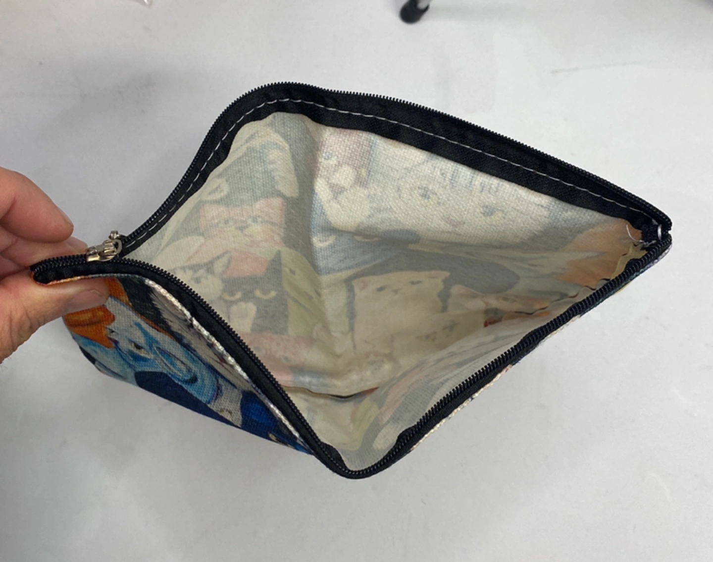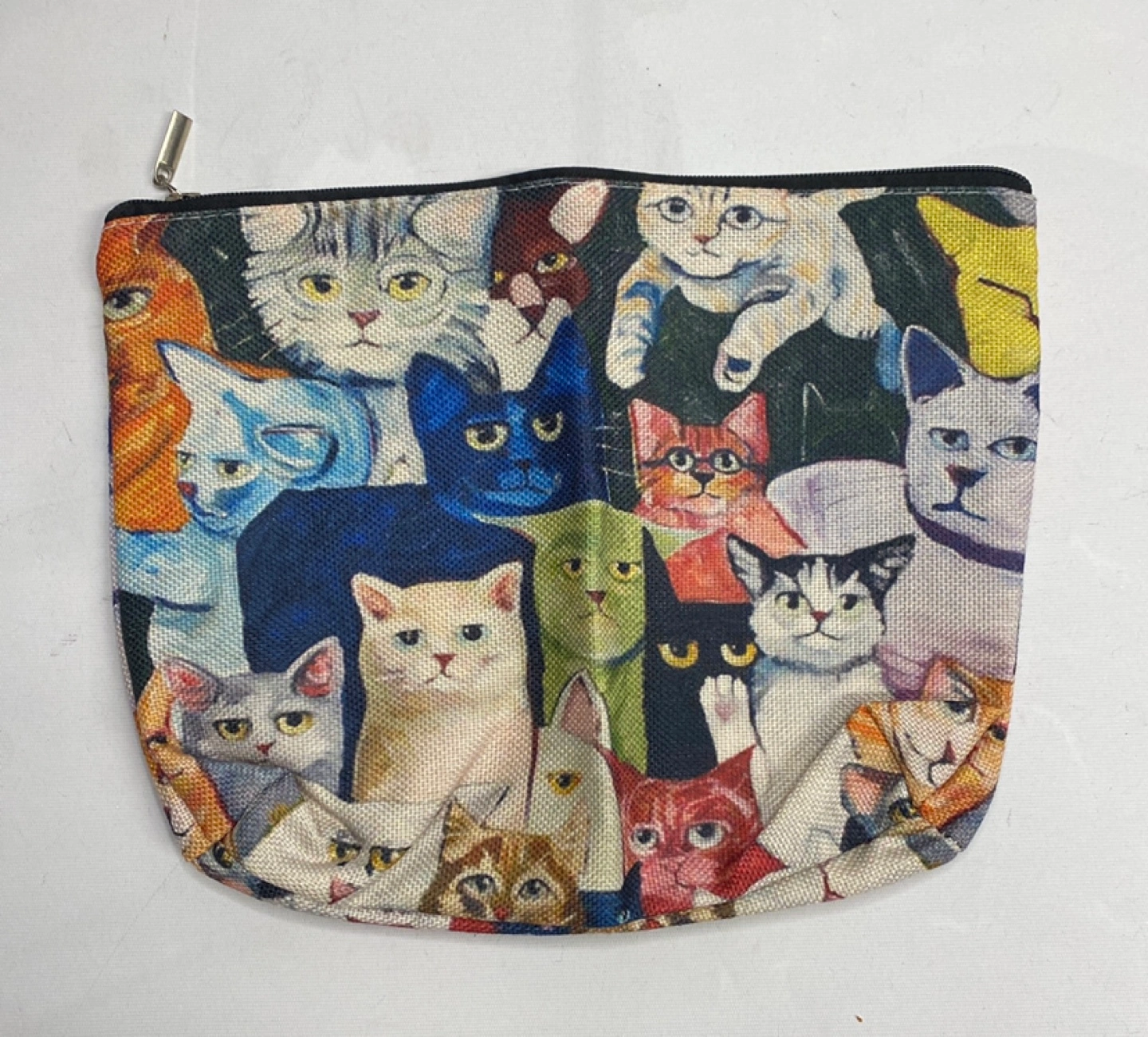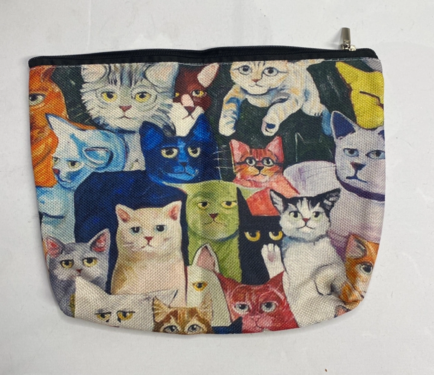 Canvas zipper pouch. Features a colourful cat print. Perfect for storing small items. Zipper closure.