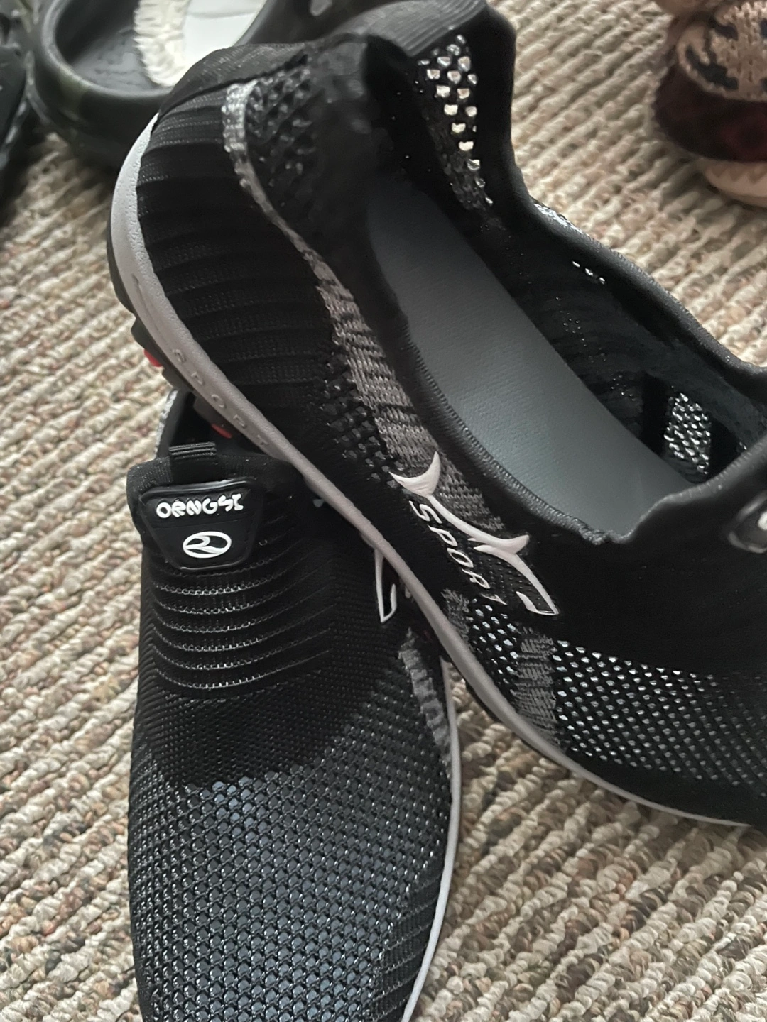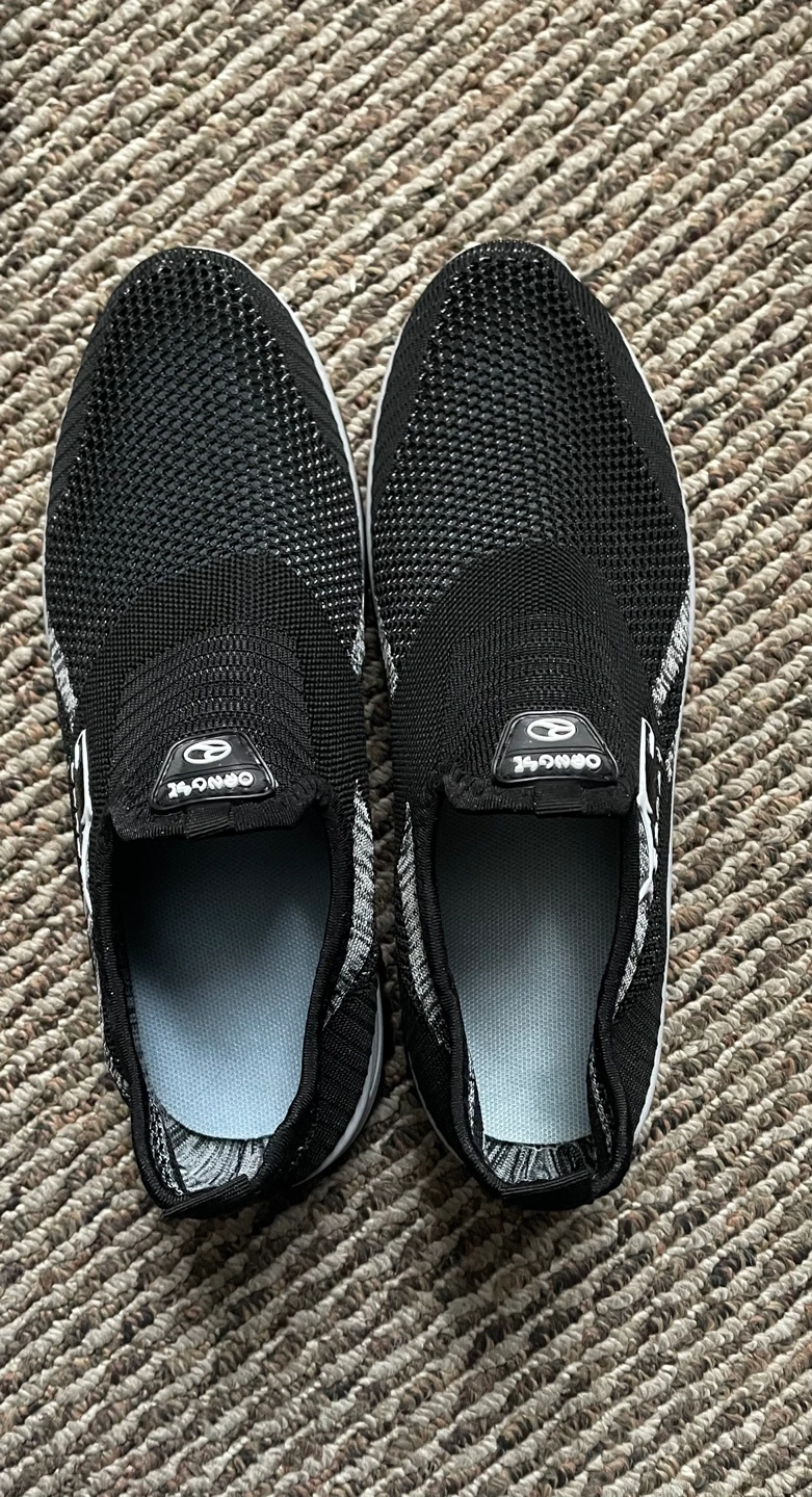 Comfortable slip-on shoes, breathable fabric, good for everyday wear. Black with grey accents. Durable sole. Men'S Breathable Mesh Sneakers, Slip-On Athletic Shoes, Solid Color Fabric Upper, Rubber Sole, Round Toe, Low Top, Casual Sports Style for Spring/Summer