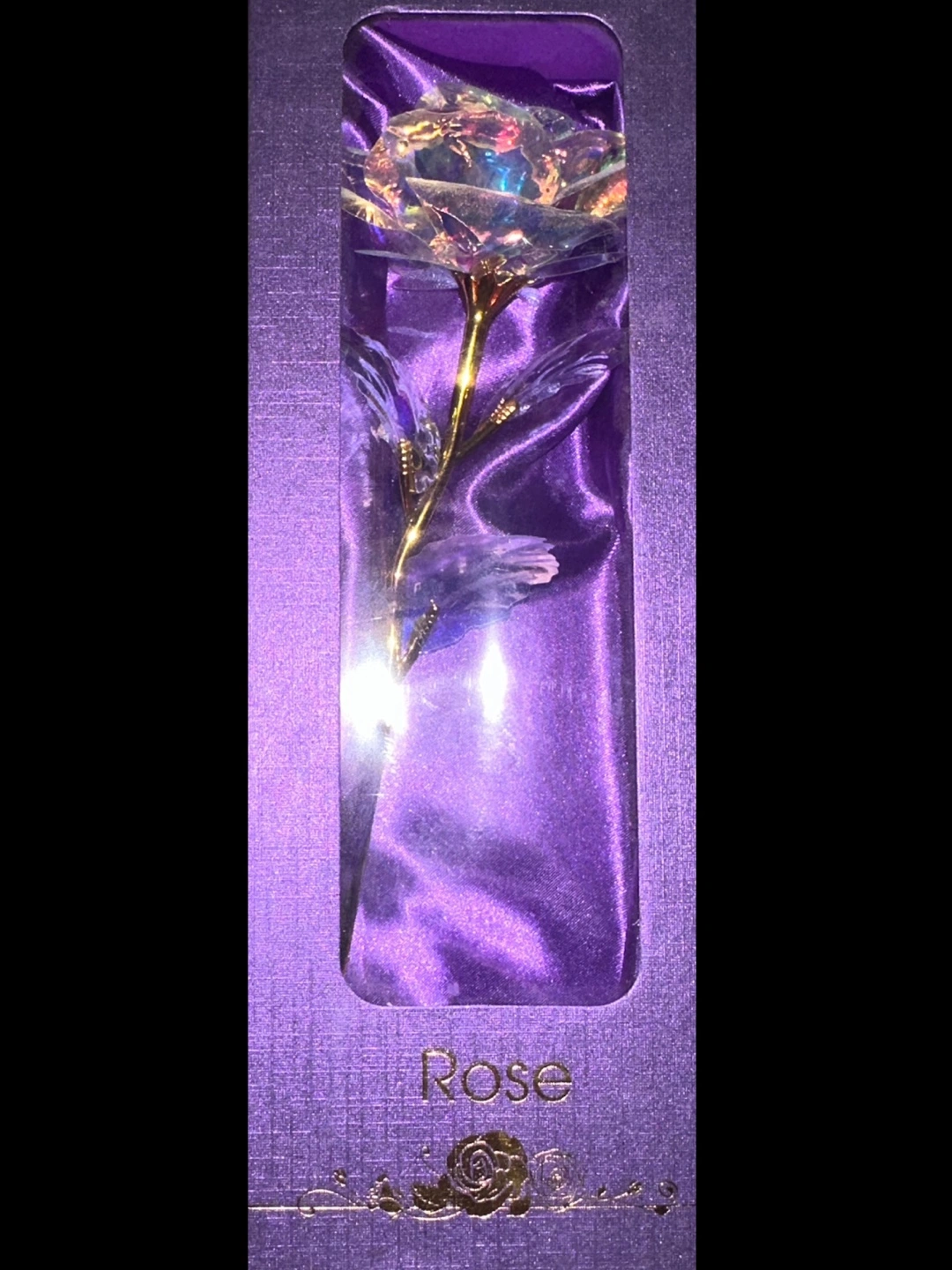 202Beautiful iridescent crystal rose with gold stem. Presents in a luxurious purple gift box. Perfect gift or home decor.