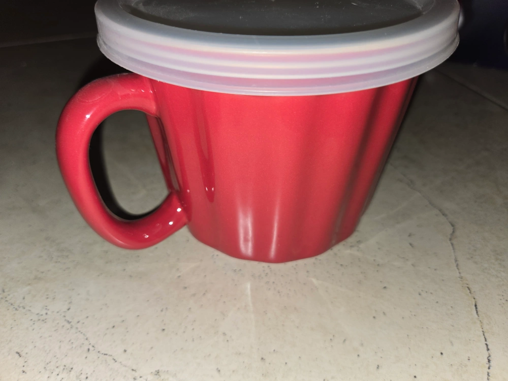 Reddish ceramic mug. Features a cream-coloured interior. Includes a lid. Perfect for coffee, tea, or hot chocolate, or cute for storage. Never used.