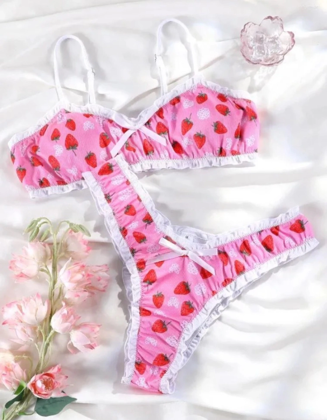 Adorable strawberry print, frilly bikini, size medium, new in package with protective strip, never worn or tried on.