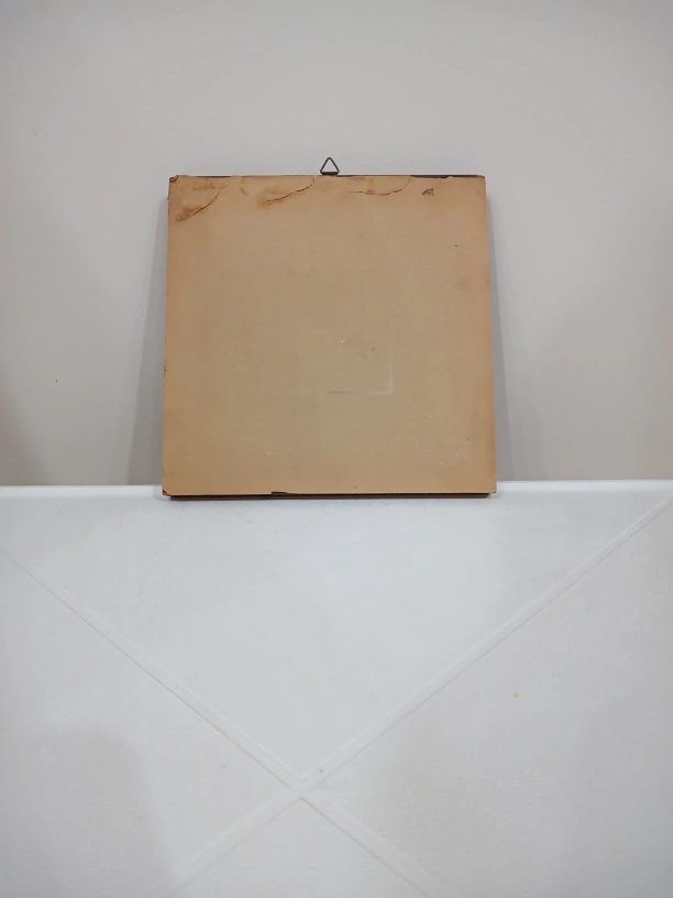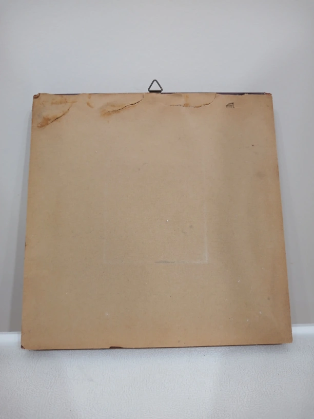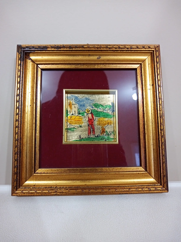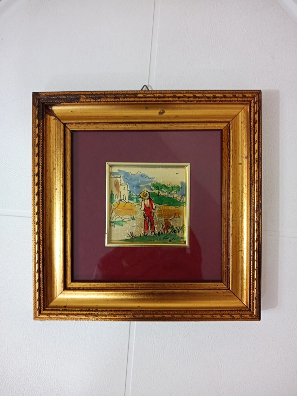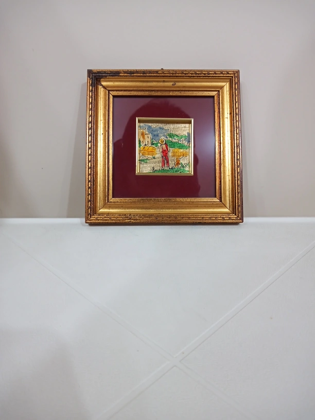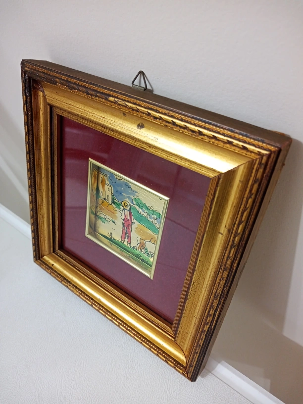 232Small framed artwork. Features a pastoral scene. Gold frame. Bordeaux matting. Wall hanging. Some damage on the back as shown in photo.