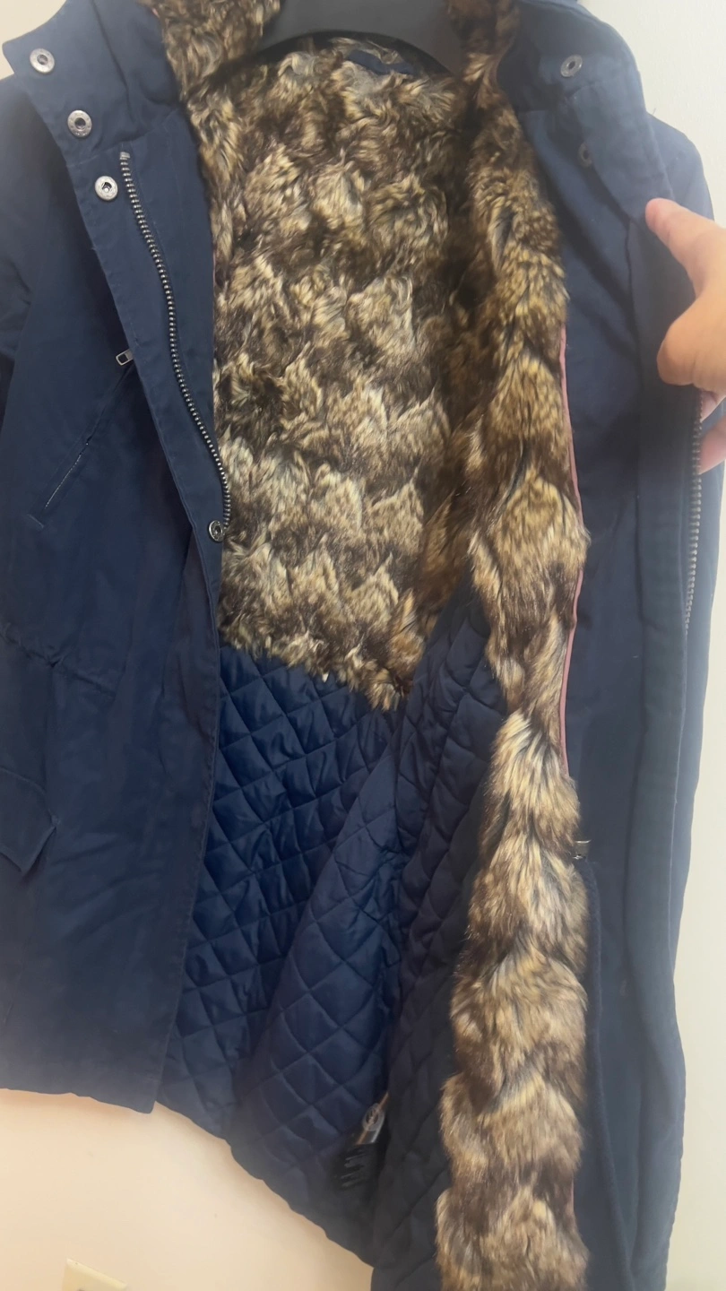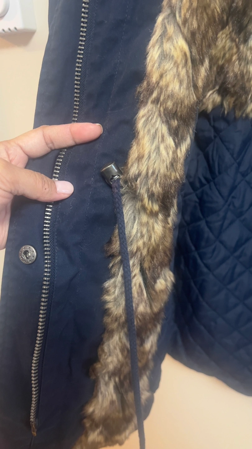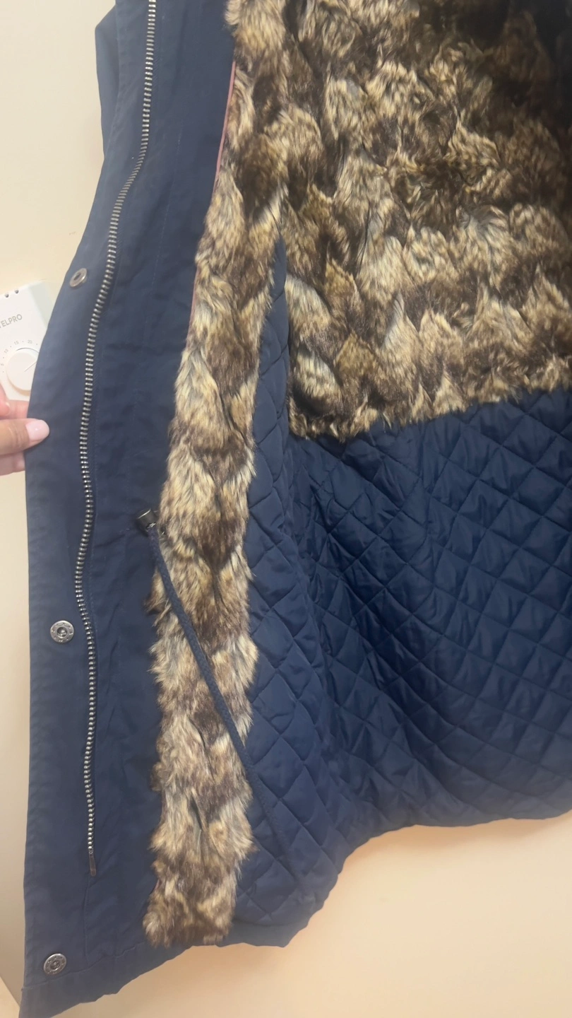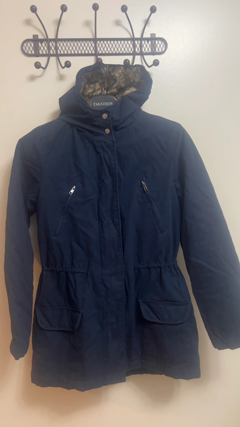 Warm winter parka. Navy blue colour. Features faux fur trim on the hood and in the interior. Quilted interior. Zipper and button closure. Multiple pockets. Great for cold weather.