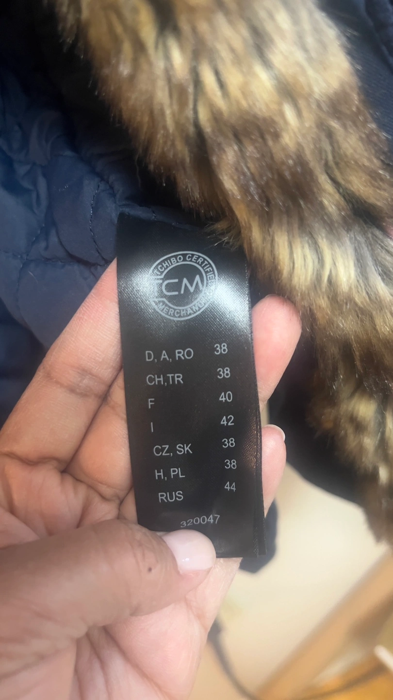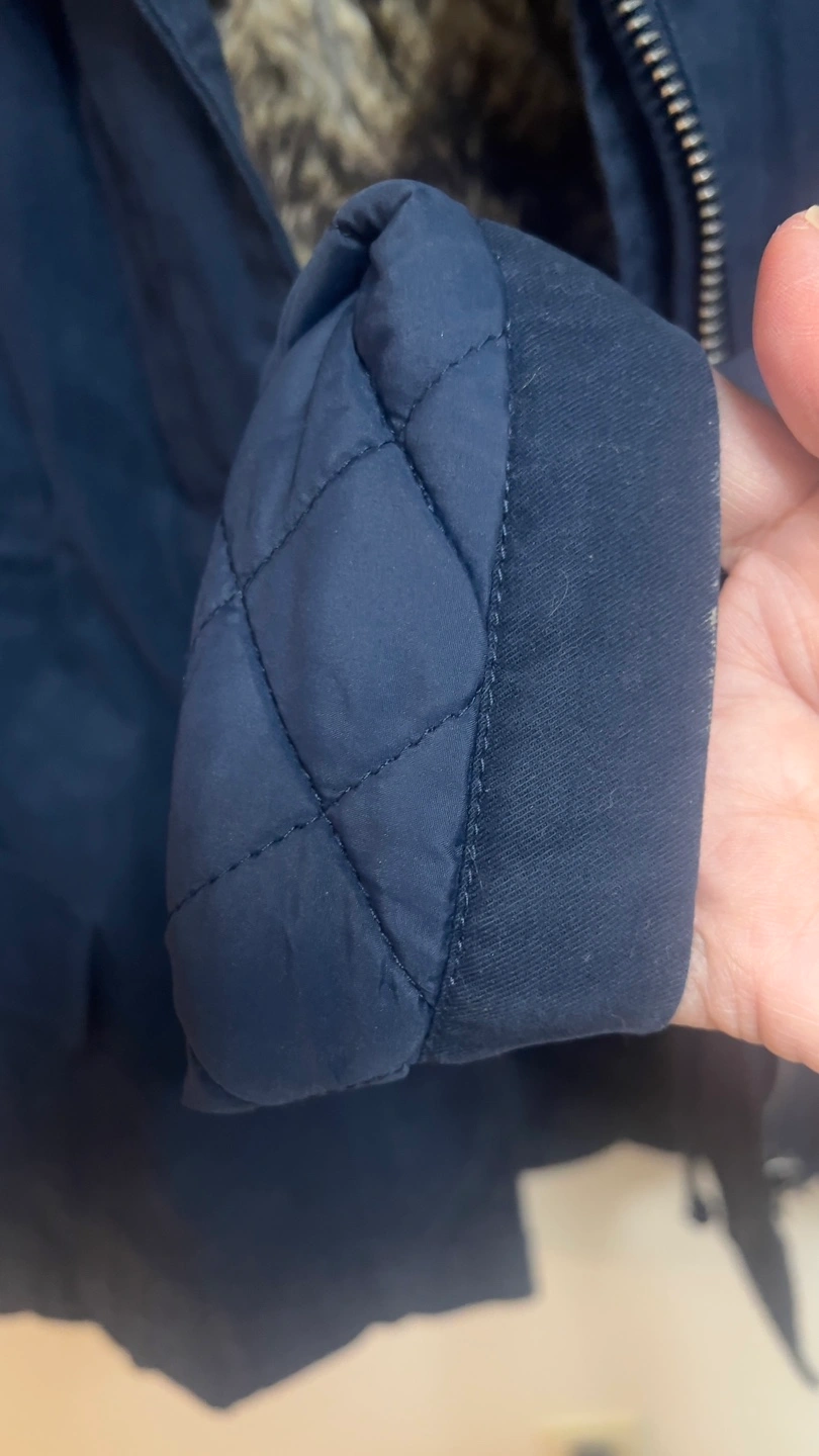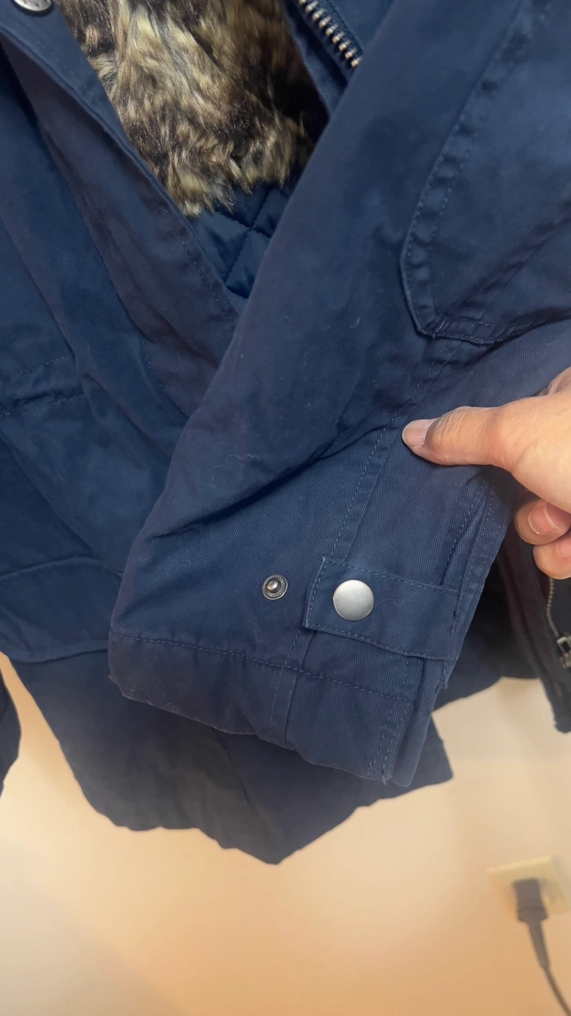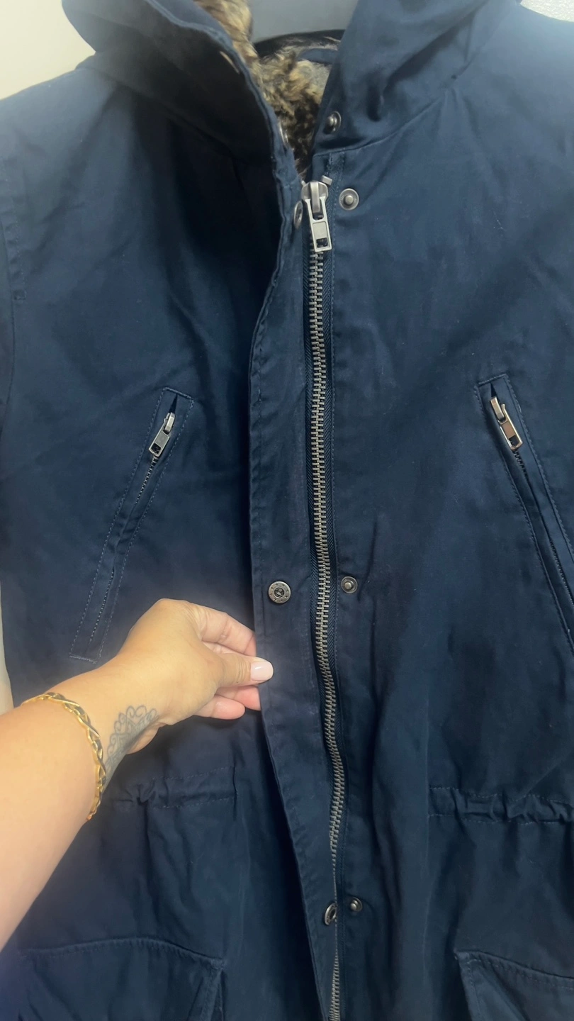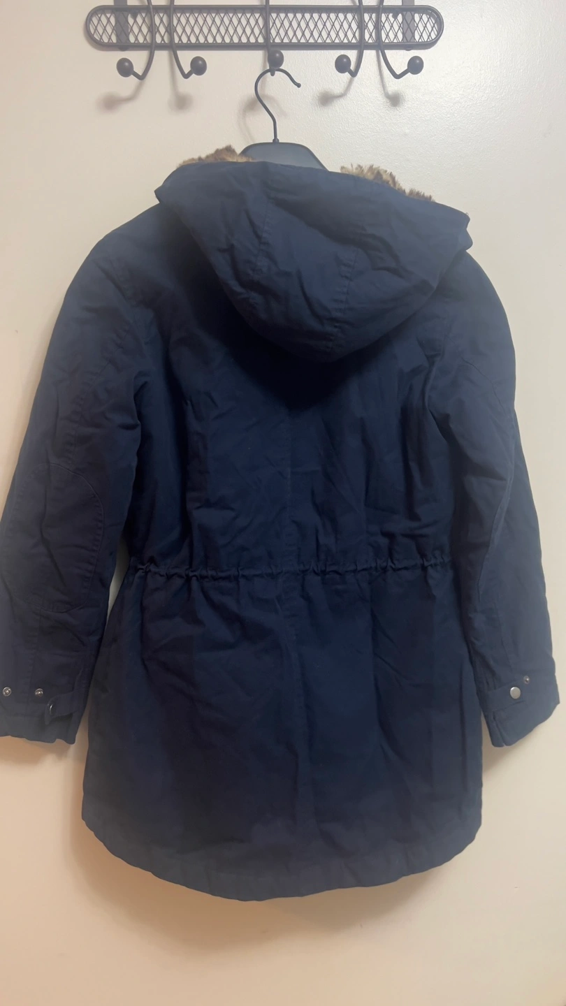 Warm winter parka. Navy blue colour. Features faux fur trim on the hood and in the interior. Quilted interior. Zipper and button closure. Multiple pockets. Great for cold weather.