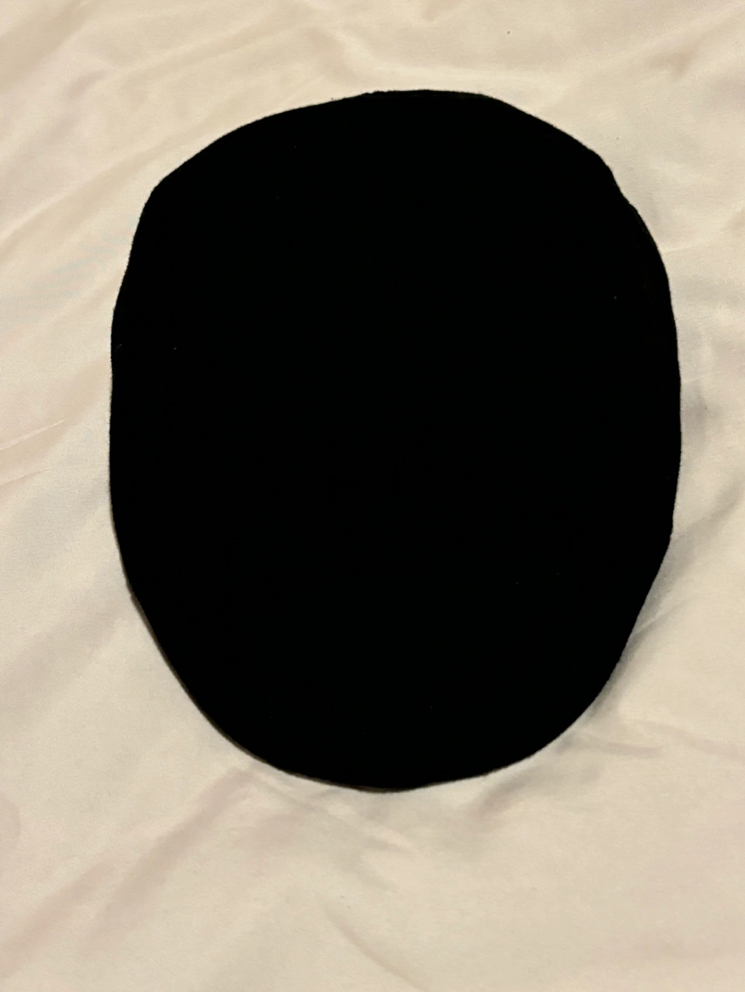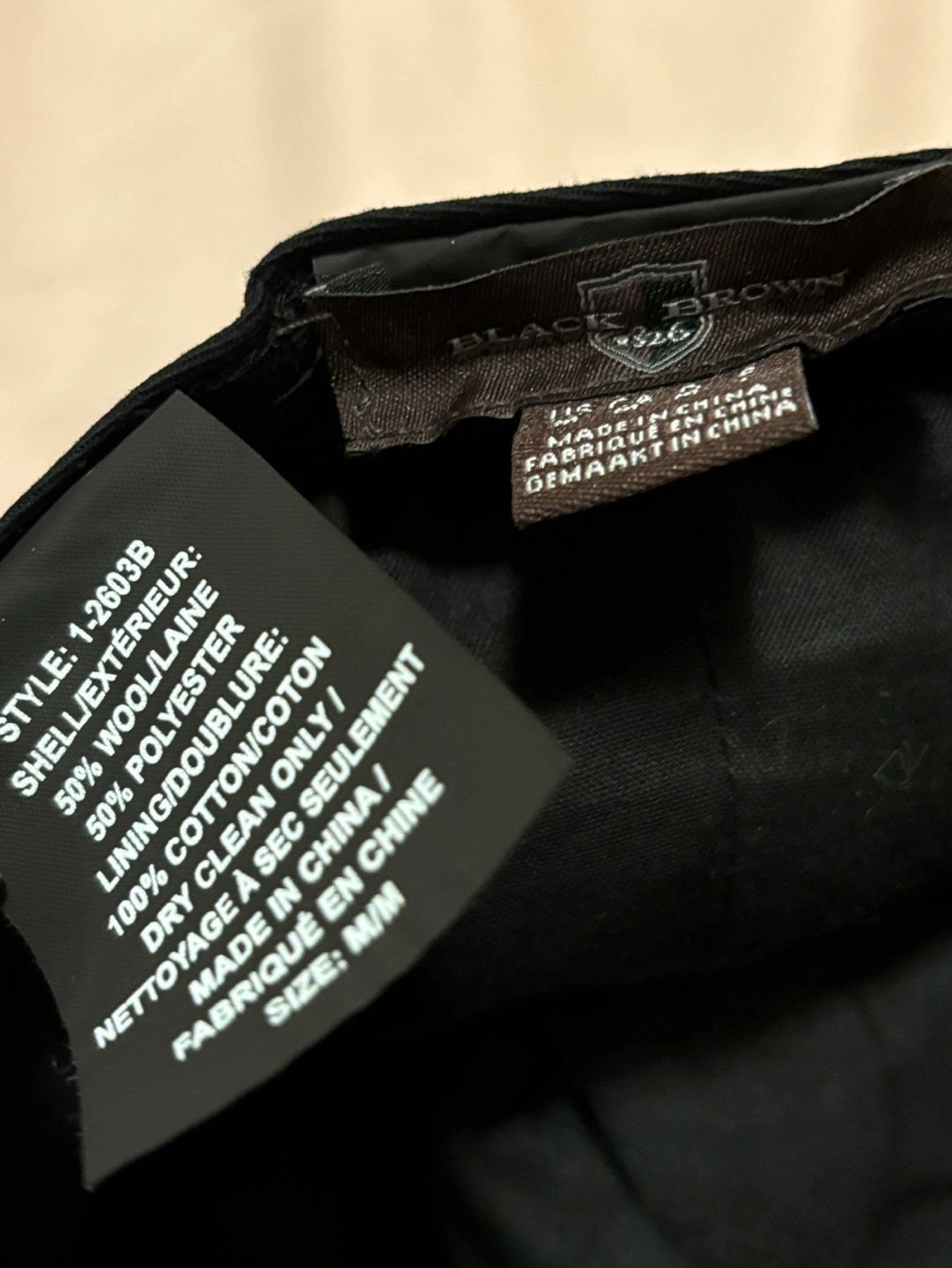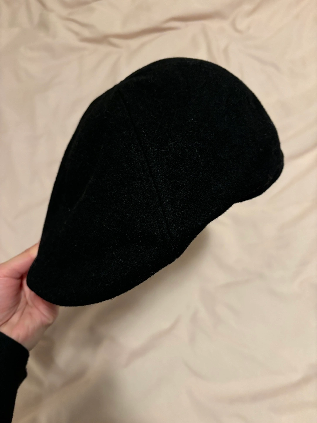 Black newsboy flat cap. 50% wool, 50% polyester shell. 100% cotton lining.