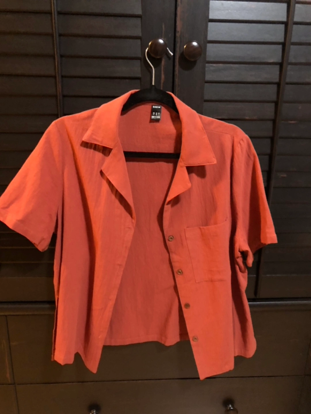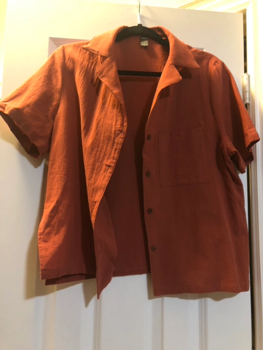 Women's burnt orange short sleeve button-up shirt. Relaxed fit. Small chest pocket. Button closure. Lightweight fabric. Pick up @ midtown or downtown. Cash only🤗
