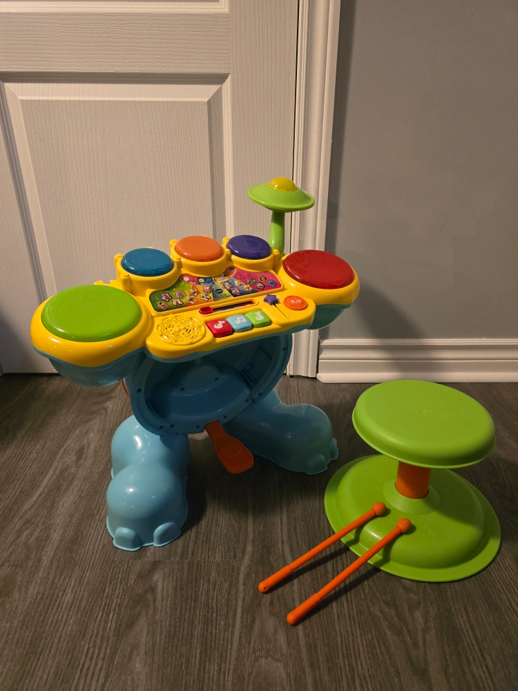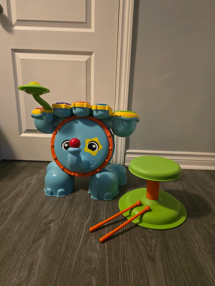 176Pick up in North York Keele St and Wilson Ave area Gently used; All pieces included ▶️ Multi Family Account / Cash only AI: Kids' drum set. Features colourful drums, cymbal, and stool. Includes drumsticks. Fun sounds and lights.