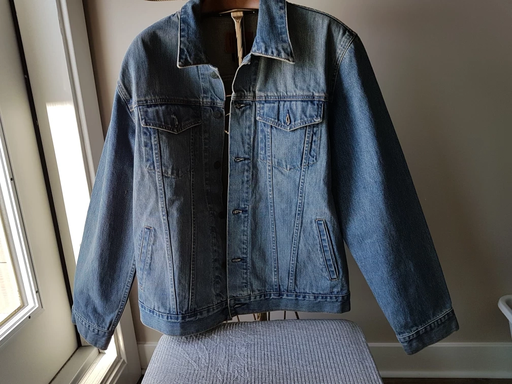 Unisex light wash denim jacket. Features button closure, chest pocket, and two lower pockets. Size Large. Please also check out my other listings on this account. This is a no pet/ smoke home. Pick Up Cochrane, Alberta