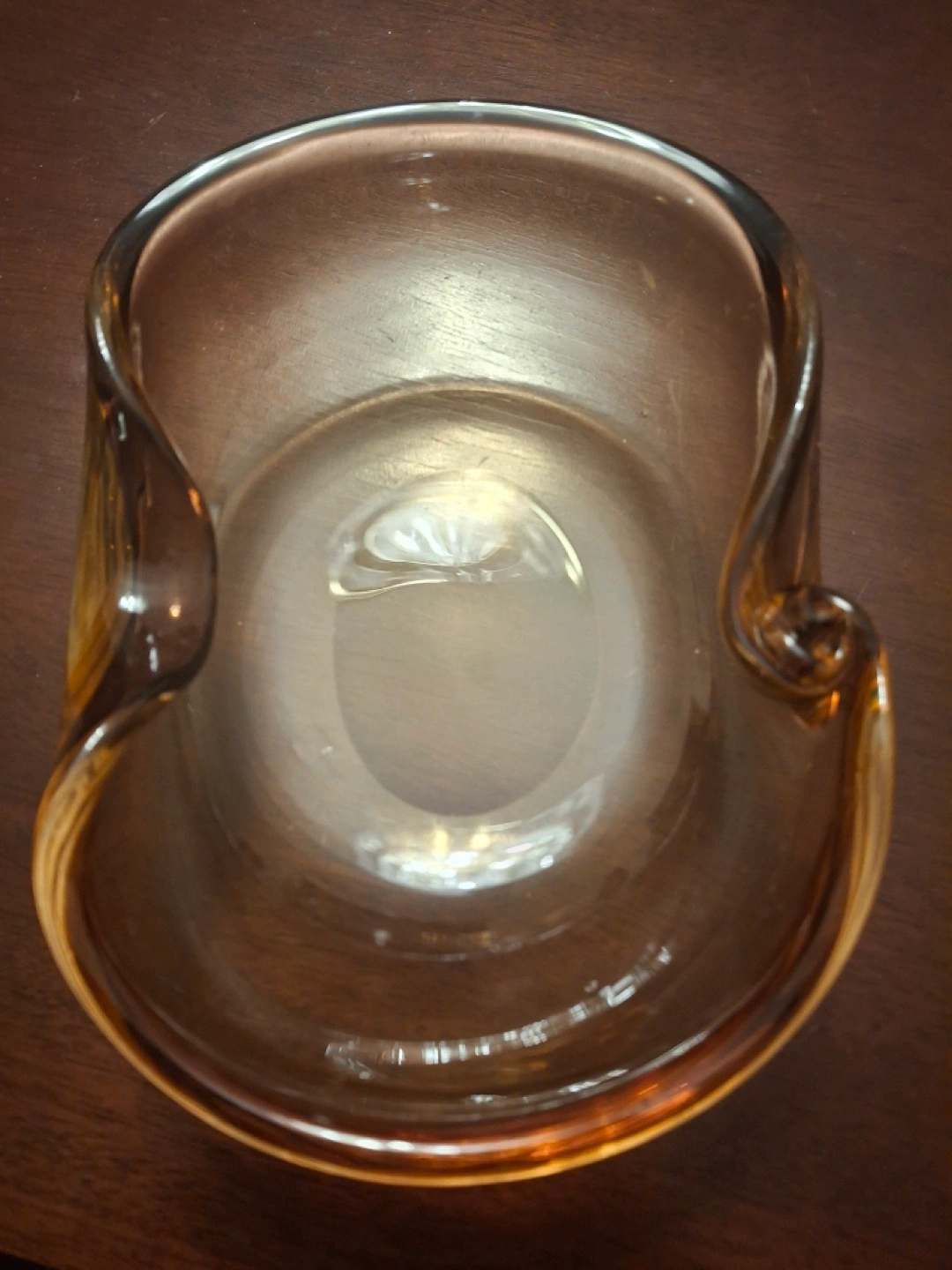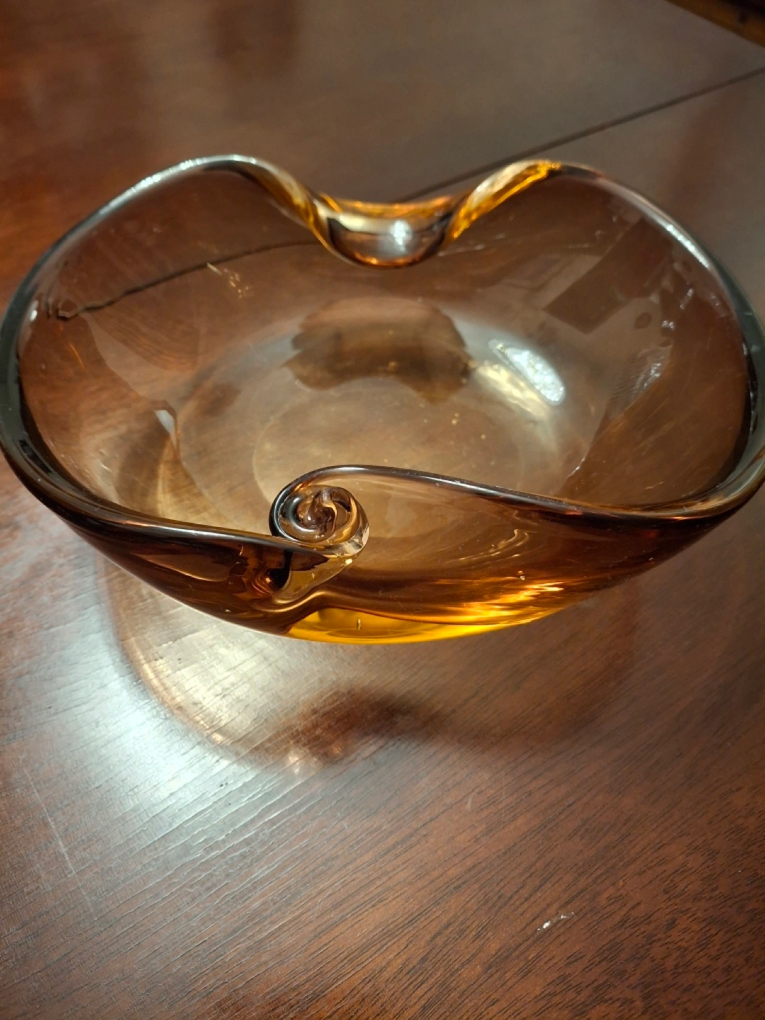 Unique amber glass bowl. Mid-century modern design. Features a wavy, organic shape. Excellent for displaying trinkets or as a decorative piece. 7.75” x 6”