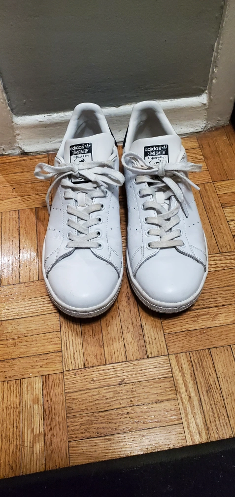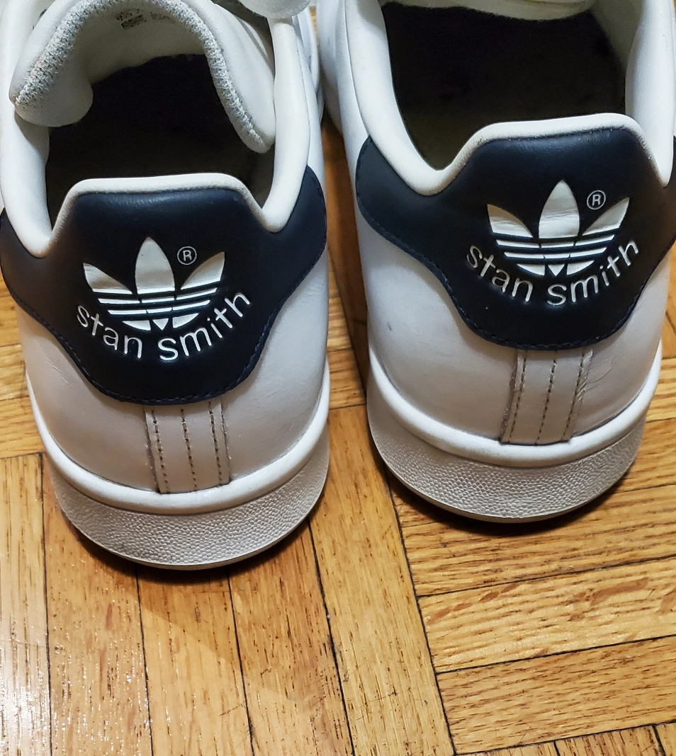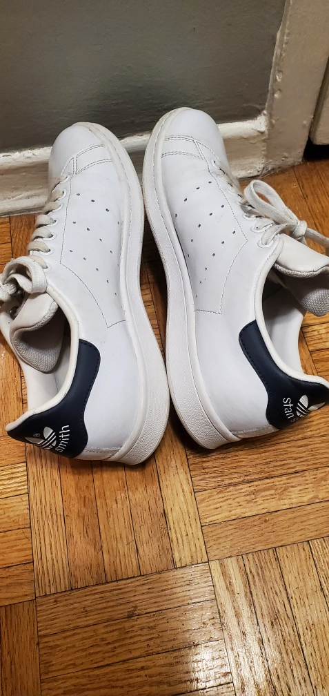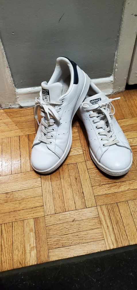Classic Adidas Stan Smith sneakers. White leather upper, navy heel tab. Excellent condition. Includes original labelling.
