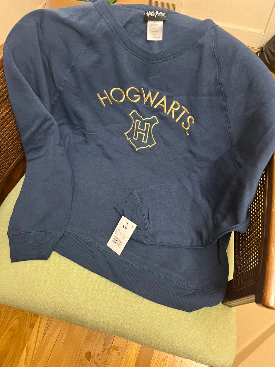 Navy blue crewneck sweatshirt. Features gold Hogwarts crest and lettering. Size XXL.